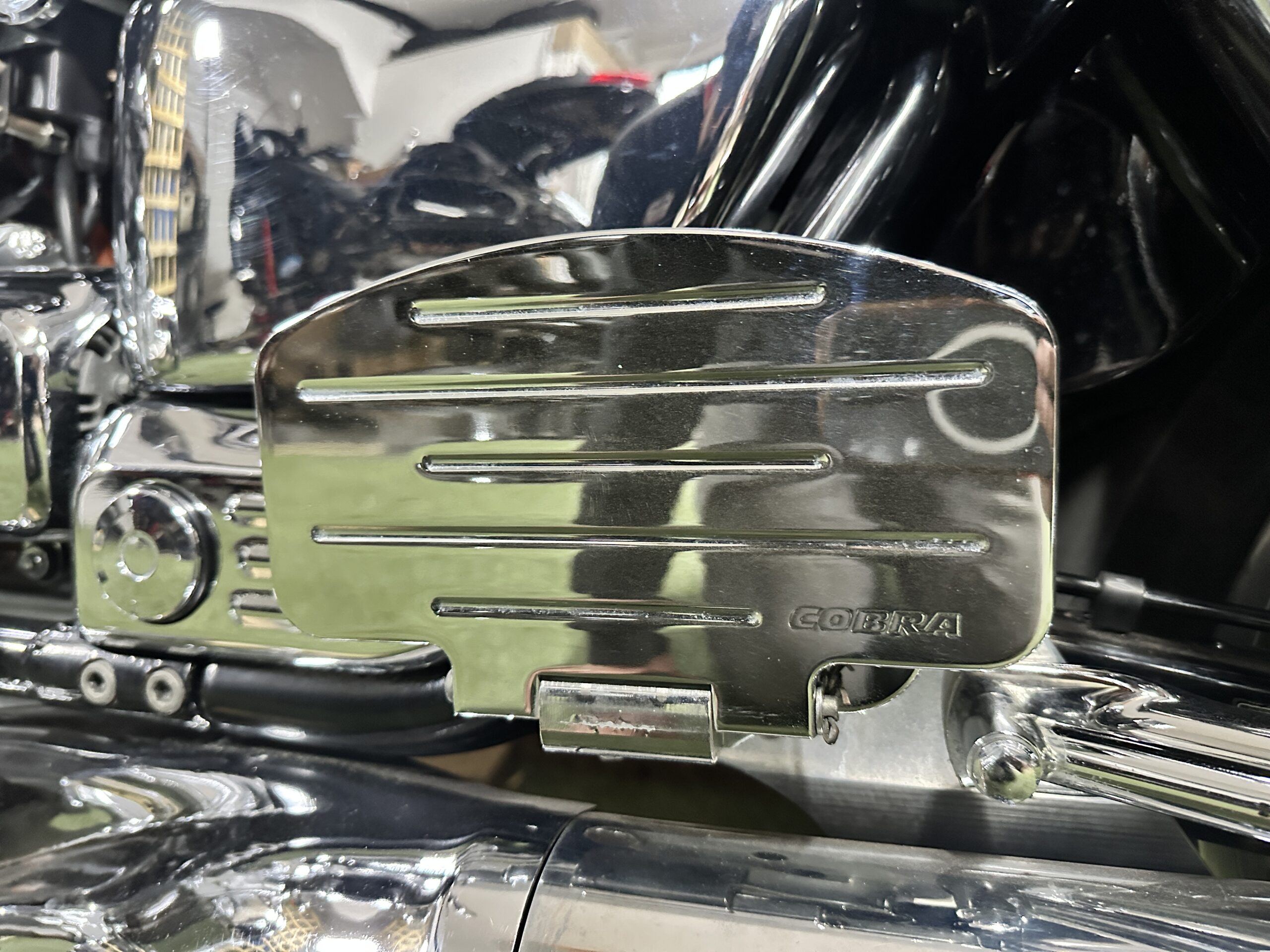 Littered with Desirable Extras: On top of its stock touring kit, this Valkyrie is absolutely littered with desirable extras to enhance looks, comfort, and functionality. It features a Clearview windshield with Gold Wing-style adjustable air vent for improved wind protection on the open road. A chrome front fender rail and chrome saddlebag guard rails give it that classic dressy cruiser appearance while protecting the fenders and bags. The radiator now wears a polished chrome radiator cover, adding shine to the front end. For two-up comfort, it’s fitted with Cobra rear floorboards (footboards) so your passenger can ride in comfort instead of pegs. The seating has been upgraded to premium Mustang seats – rider seat, pillion seat, and even a matching Mustang backrest – offering plush, all-day comfort for both rider and passenger. You’ll also find pillion handrails added, giving your passenger extra confidence and security. The bike gleams with additional chrome accents: a Valkyrie logo sissy bar chrome cover, chrome handlebar riser cover, chrome tank top and side covers, and chrome triple-tree covers. It even has custom jacking bars (discreetly fitted under the frame) to make maintenance or lifting the bike easier. In short, nearly every bolt-on accessory you could want has already been added – this Valkyrie comes loaded with bling and upgrades front to back, making it stand out from the crowd. All these extras not only look fantastic but also add to the bike’s usability and individuality. You’d be hard-pressed to find another Valkyrie with this many tasteful additions already on it – it’s truly loaded and ready to show off.