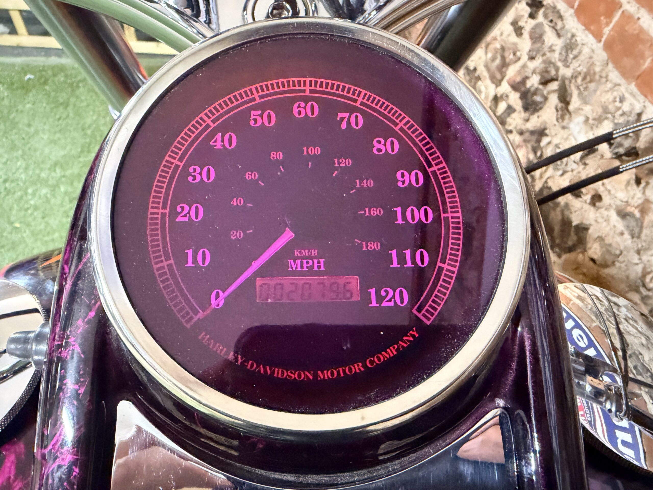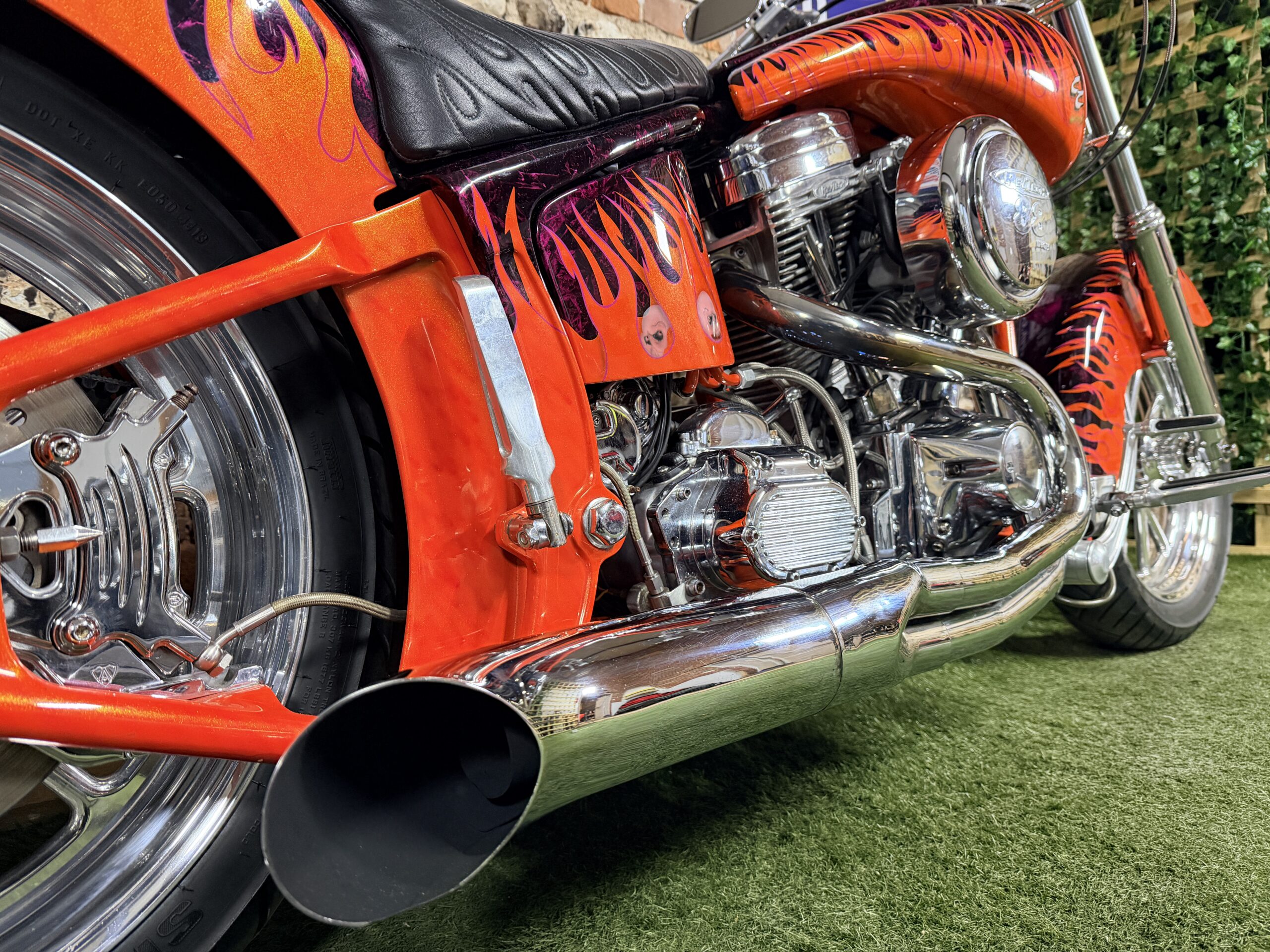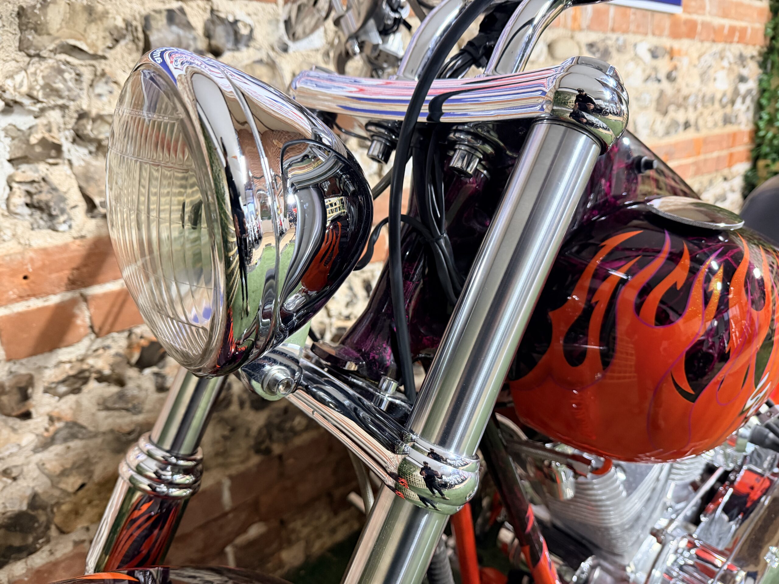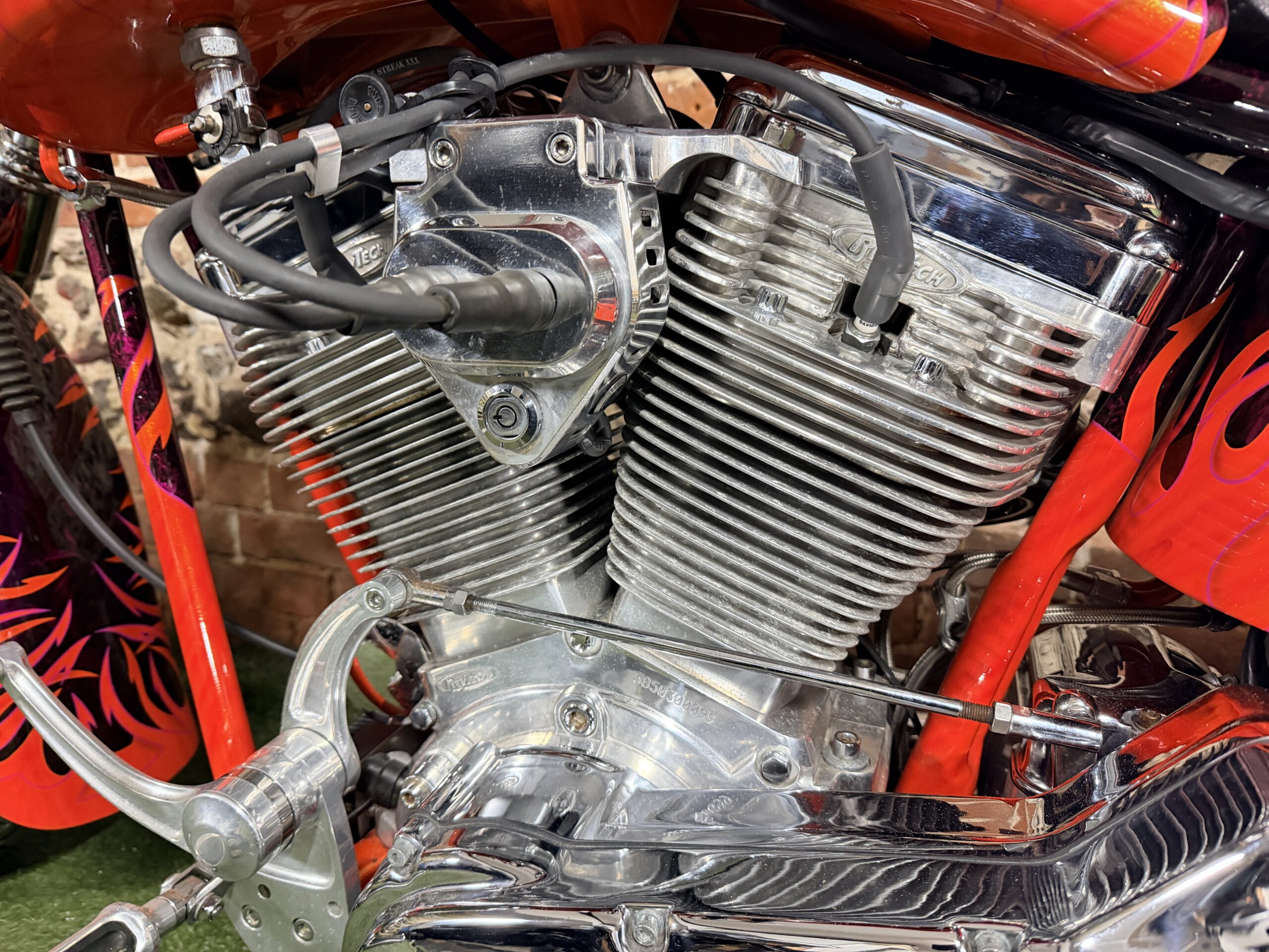 Despite being a showstopper, this bike isn’t a trailer queen – it’s fully sorted to ride and enjoy. It has incredibly low mileage, just 2,085 miles from new (the engine isn’t even broken-in by Harley standards!). We just treated it to an oil and filter change for peace of mind, and also put a brand new Metzeler tyre up front to match the rear – so you’ve got fresh, high-quality rubber on both ends. On the road, it feels solid and surprisingly comfortable for a custom (that Softail DNA means you get the hidden rear suspension smoothing out the bumps). It tracks straight, stops well, and that Mikuni-fed RevTech pulls strongly in every gear. Being a 23-year-old custom, it does have a minor quirk: a slight oil leak (think of it as a tiny marking of territory, as many Harleys do!). It’s nothing dramatic – just a small drip typical for an older bike – and it doesn’t affect the performance or reliability one bit. I’m just mentioning it in the spirit of full transparency. Overall condition is fantastic for a bike of this age – paint is stunning, chrome is bright, and everything works as it should.