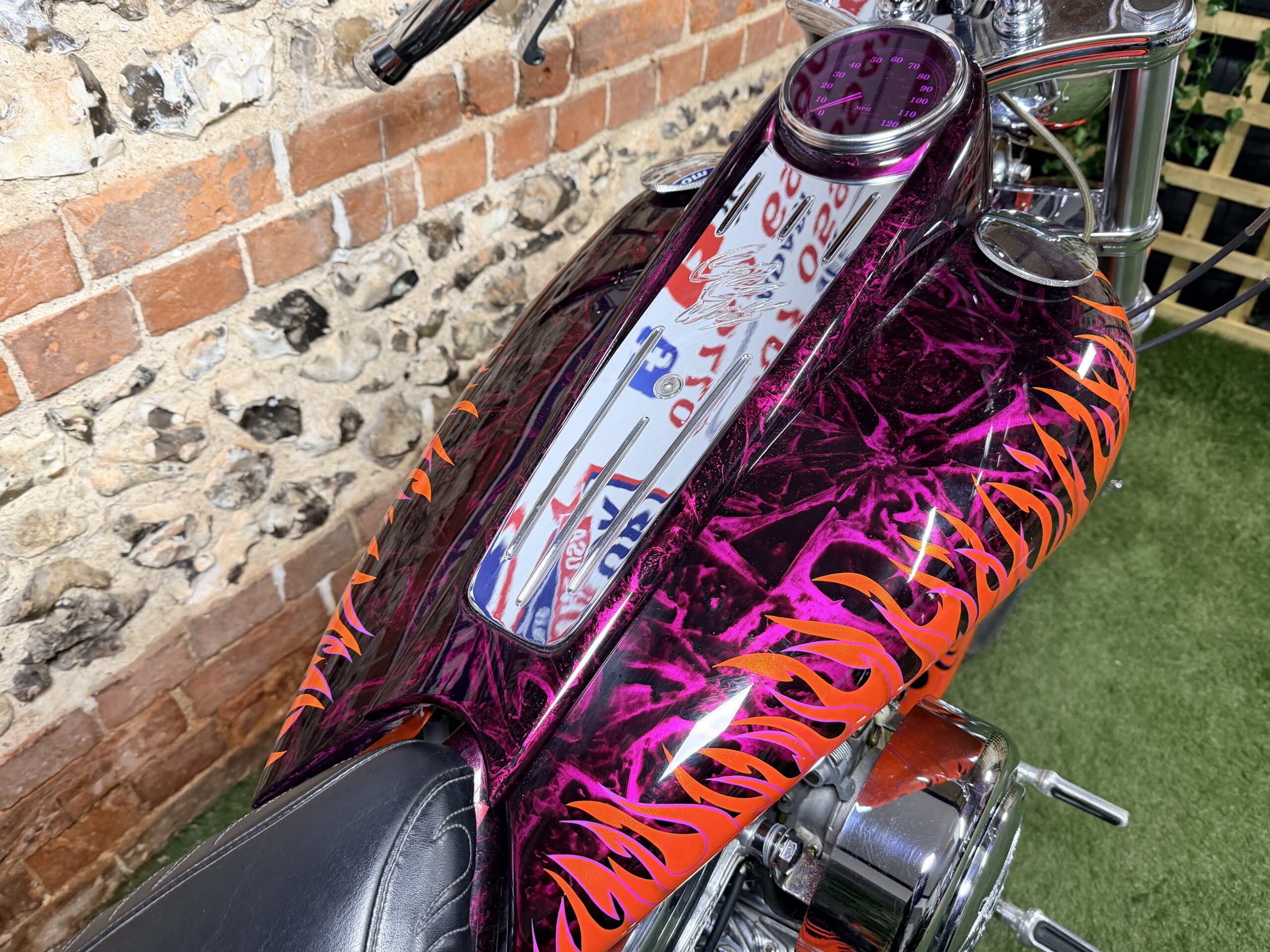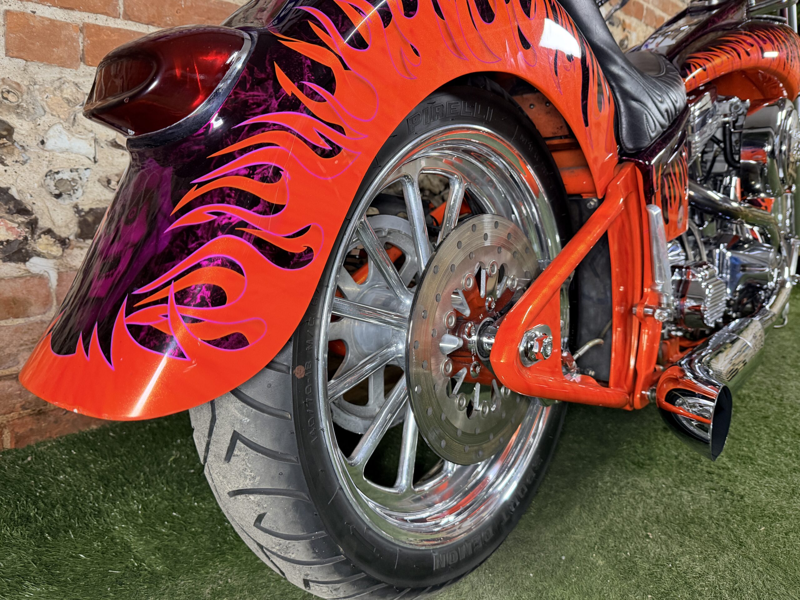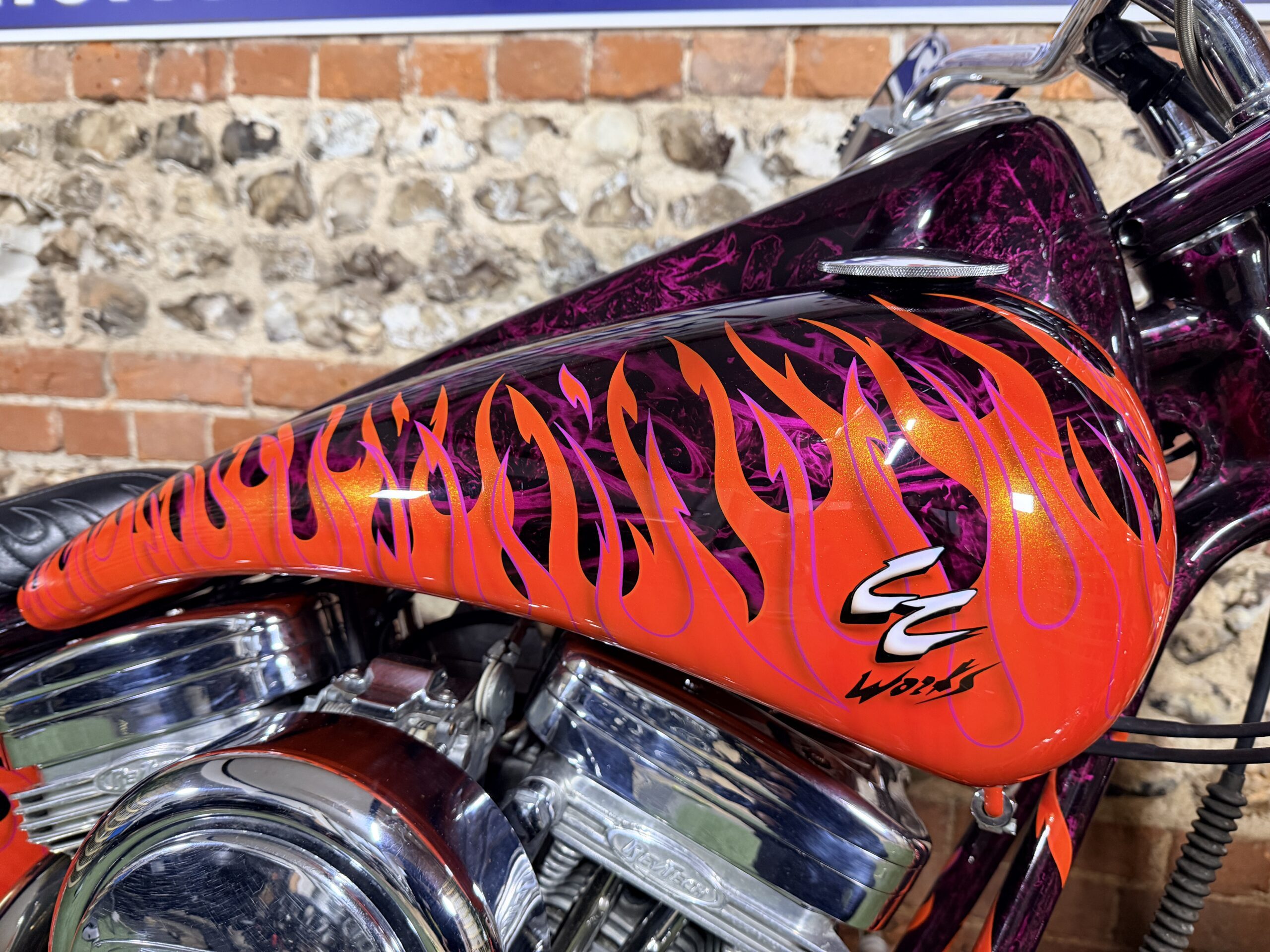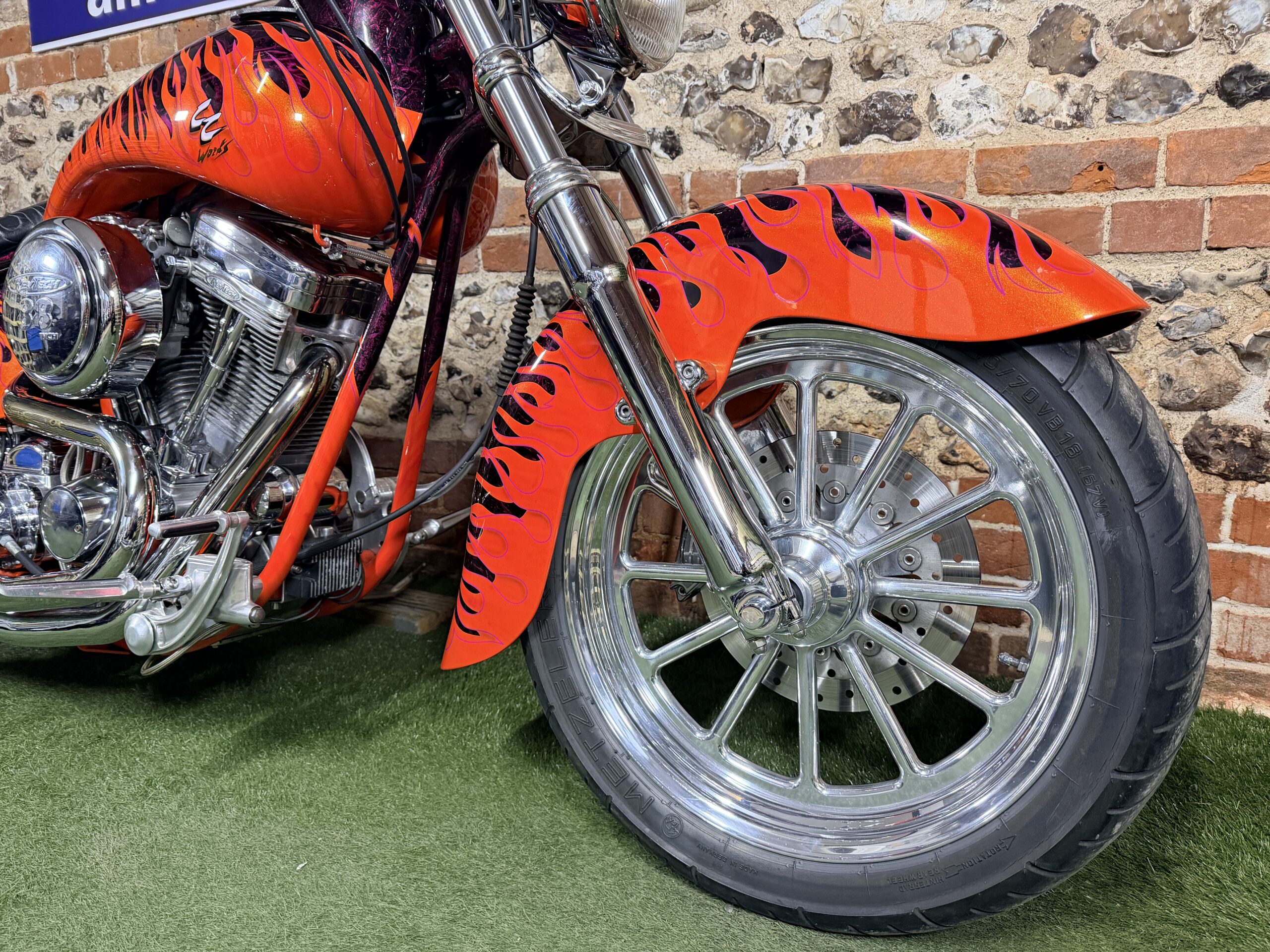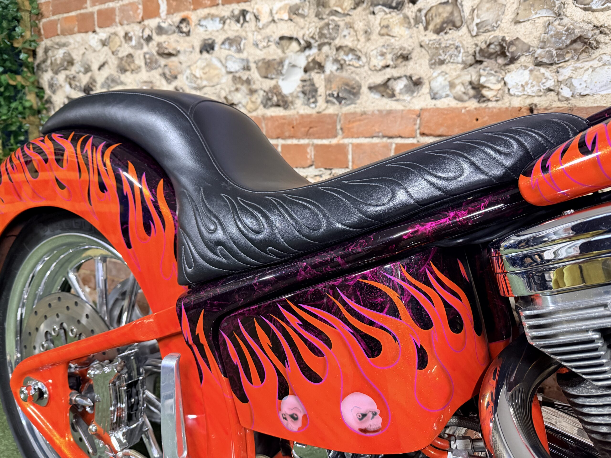 Despite being a showstopper, this bike isn’t a trailer queen – it’s fully sorted to ride and enjoy. It has incredibly low mileage, just 2,085 miles from new (the engine isn’t even broken-in by Harley standards!). We just treated it to an oil and filter change for peace of mind, and also put a brand new Metzeler tyre up front to match the rear – so you’ve got fresh, high-quality rubber on both ends. On the road, it feels solid and surprisingly comfortable for a custom (that Softail DNA means you get the hidden rear suspension smoothing out the bumps). It tracks straight, stops well, and that Mikuni-fed RevTech pulls strongly in every gear. Being a 23-year-old custom, it does have a minor quirk: a slight oil leak (think of it as a tiny marking of territory, as many Harleys do!). It’s nothing dramatic – just a small drip typical for an older bike – and it doesn’t affect the performance or reliability one bit. I’m just mentioning it in the spirit of full transparency. Overall condition is fantastic for a bike of this age – paint is stunning, chrome is bright, and everything works as it should.