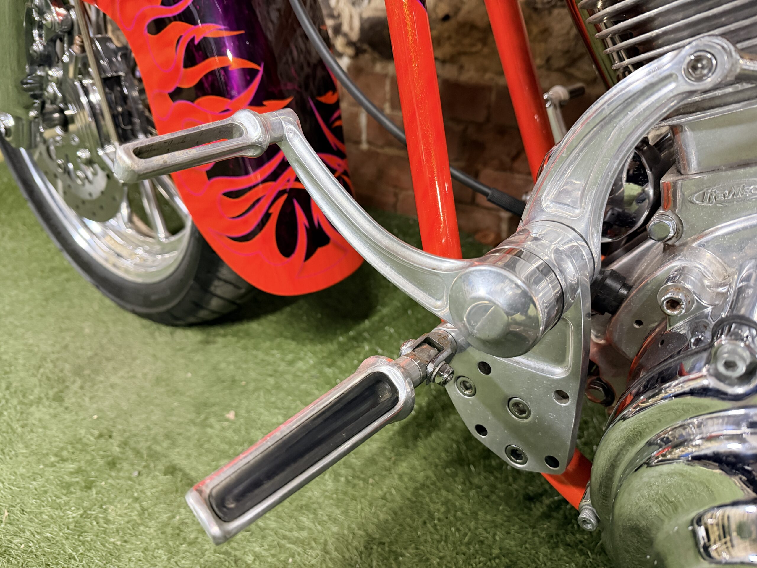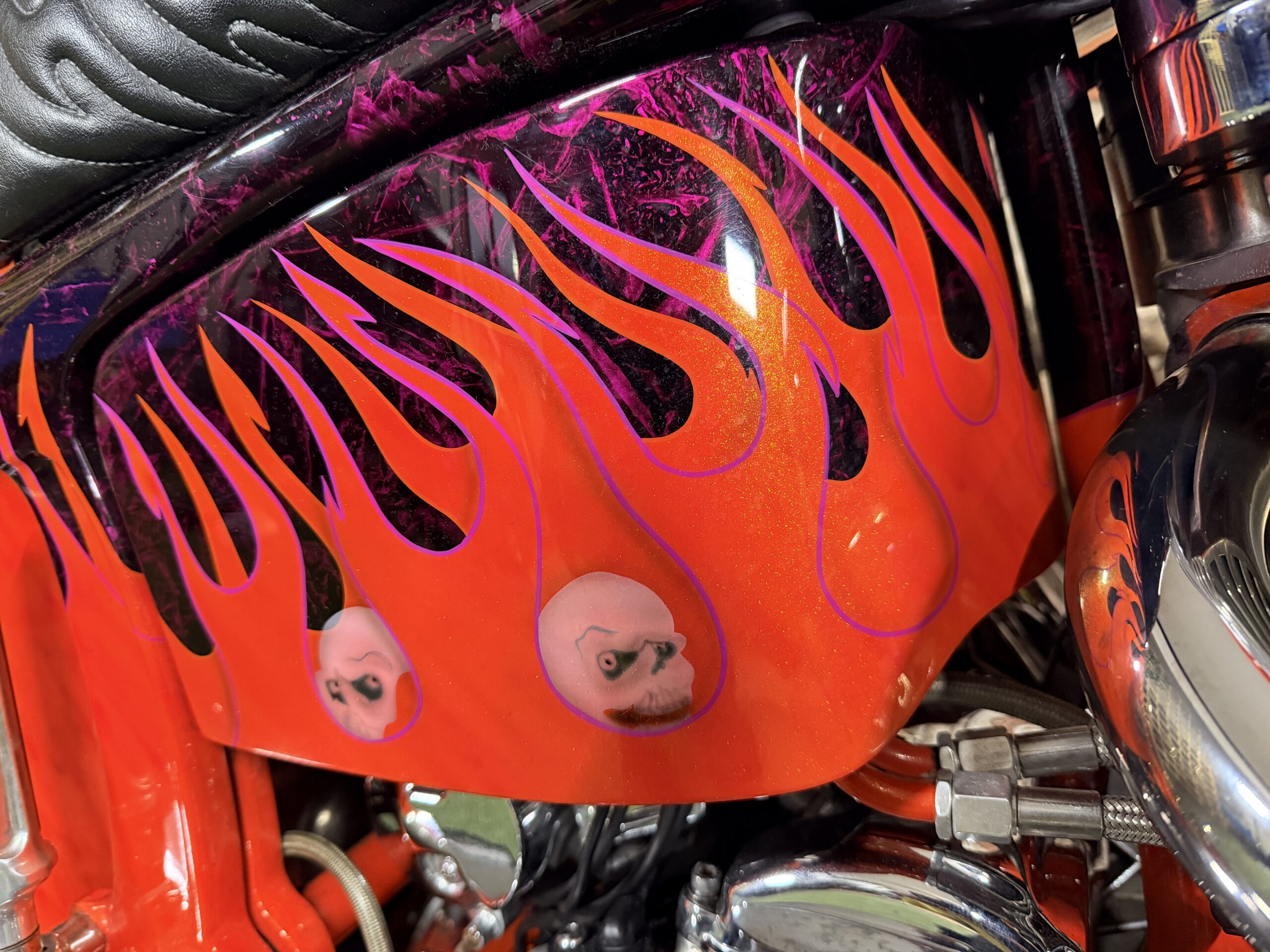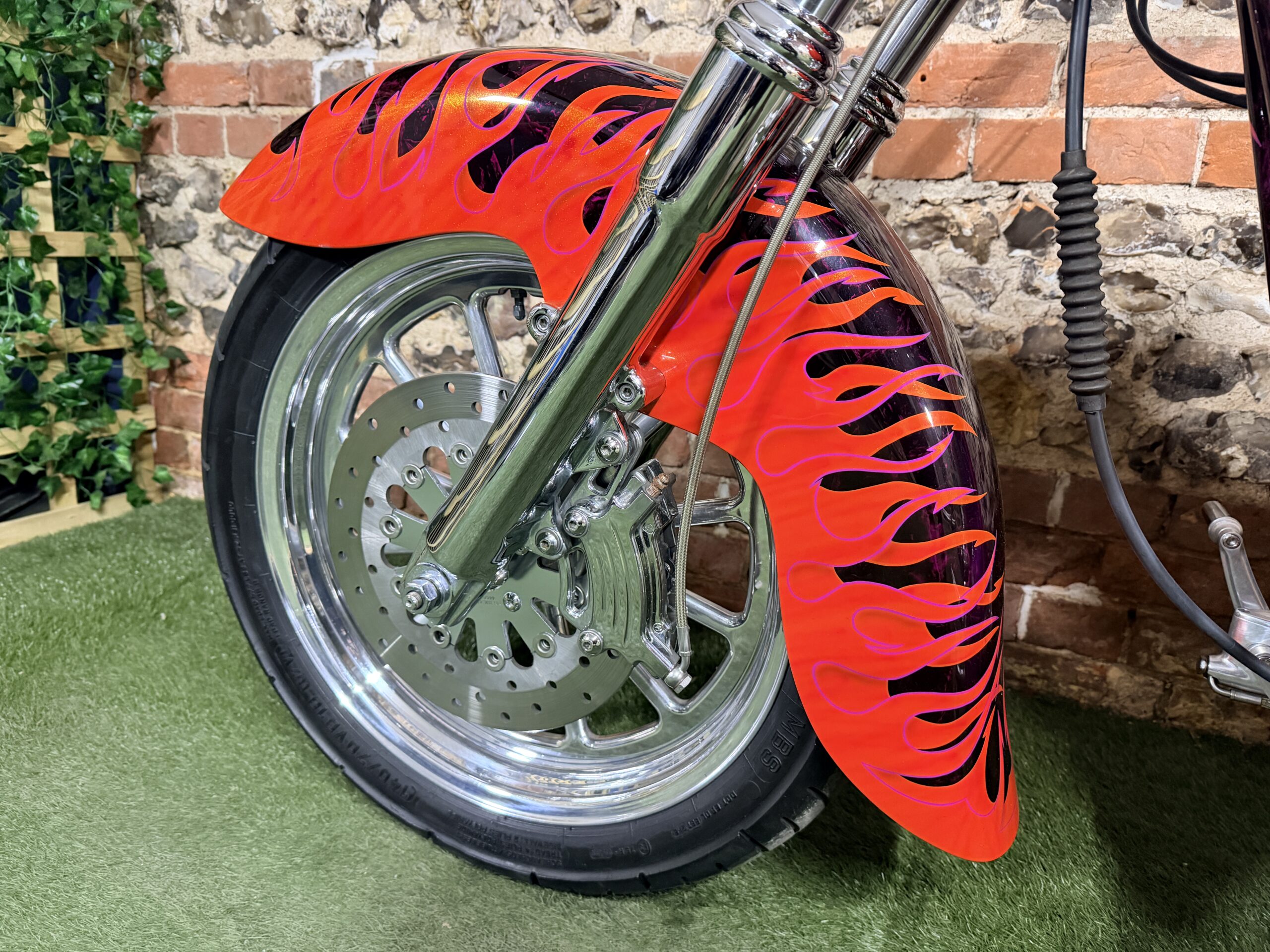 Now, the first thing everyone notices is that insane paint job – and pictures hardly do it justice. Keith Baker is a master of custom paint (over 40 years in the game), and he knocked it out of the park on this one. The bike wears a deep metallic purple base, and it’s absolutely engulfed in vivid orange flame graphics licking down the tank and fenders. Look closely and you’ll spot the skulls ghosted in the flames – subtle until they catch the light, then they jump out and grab you. This paintwork is truly show-quality (Keith’s known for award-winning flames), and to have something like this done today would easily cost over £8,000. Everywhere you look, there’s also an abundance of polished billet aluminum parts catching the eye – from the rare 12-spoke billet alloy wheels (these wheels alone were about £1,500 each, and you’ll likely never see another set on a bike like this, the moulds were designed by American Racing Equipment who sold them to Performance Machine. Performance Machine then made the wheels but in extremely low volume.) to the custom billet forward controls and covers. The chrome and billet bits gleam against that wild paint, giving the whole bike a showroom/custom show trophy vibe. It’s the kind of machine you can stare at for ages and keep noticing new details.