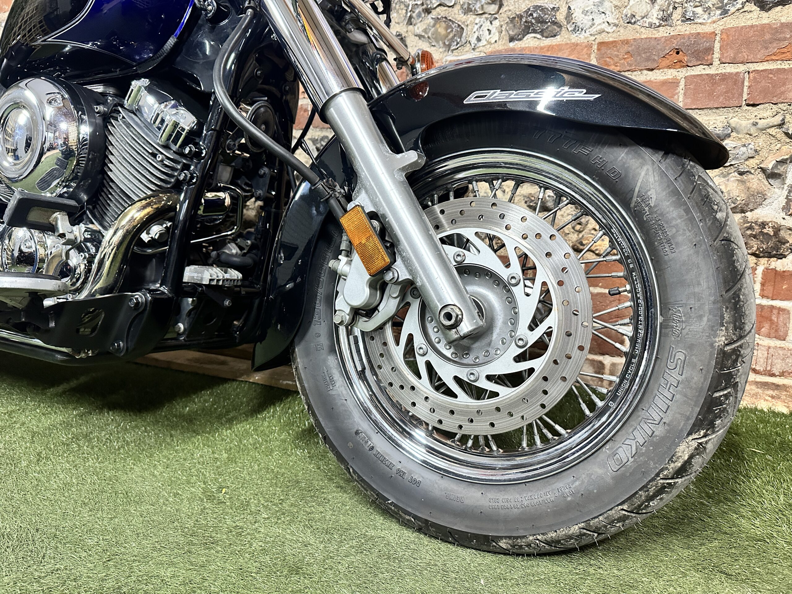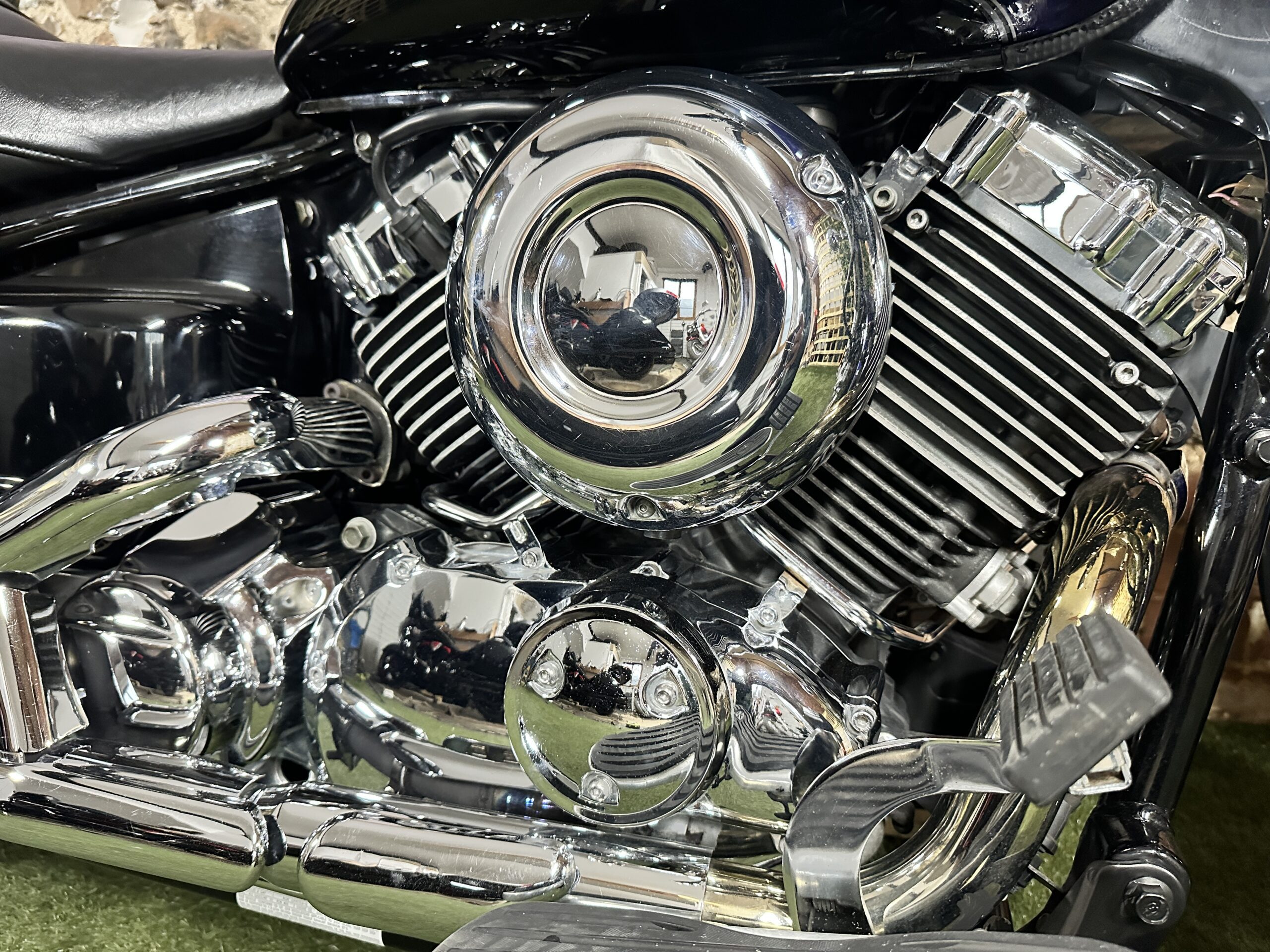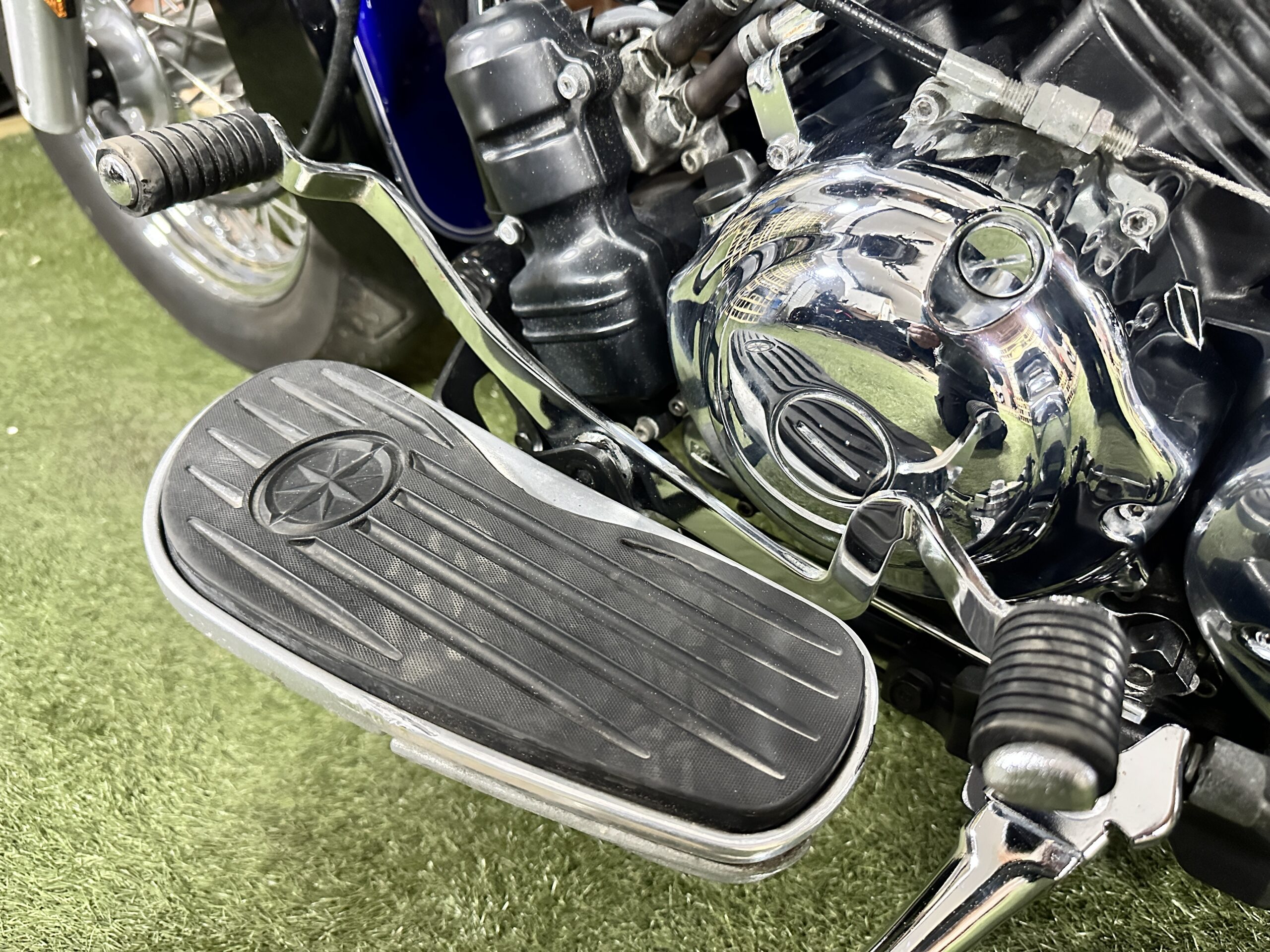 Colour: The bike’s factory Black/Blue metallic paint scheme is a real head-turner. In the sunlight, the blue flake in the paint pops against the black, underlining the Classic’s beautiful lines. Coupled with loads of chrome on the engine, spoked wheels, and chunky exhaust pipes, this DragStar exudes the authentic cruiser look that never goes out of style. (And yes, all that chrome and paintwork is in excellent condition – more on that below!)