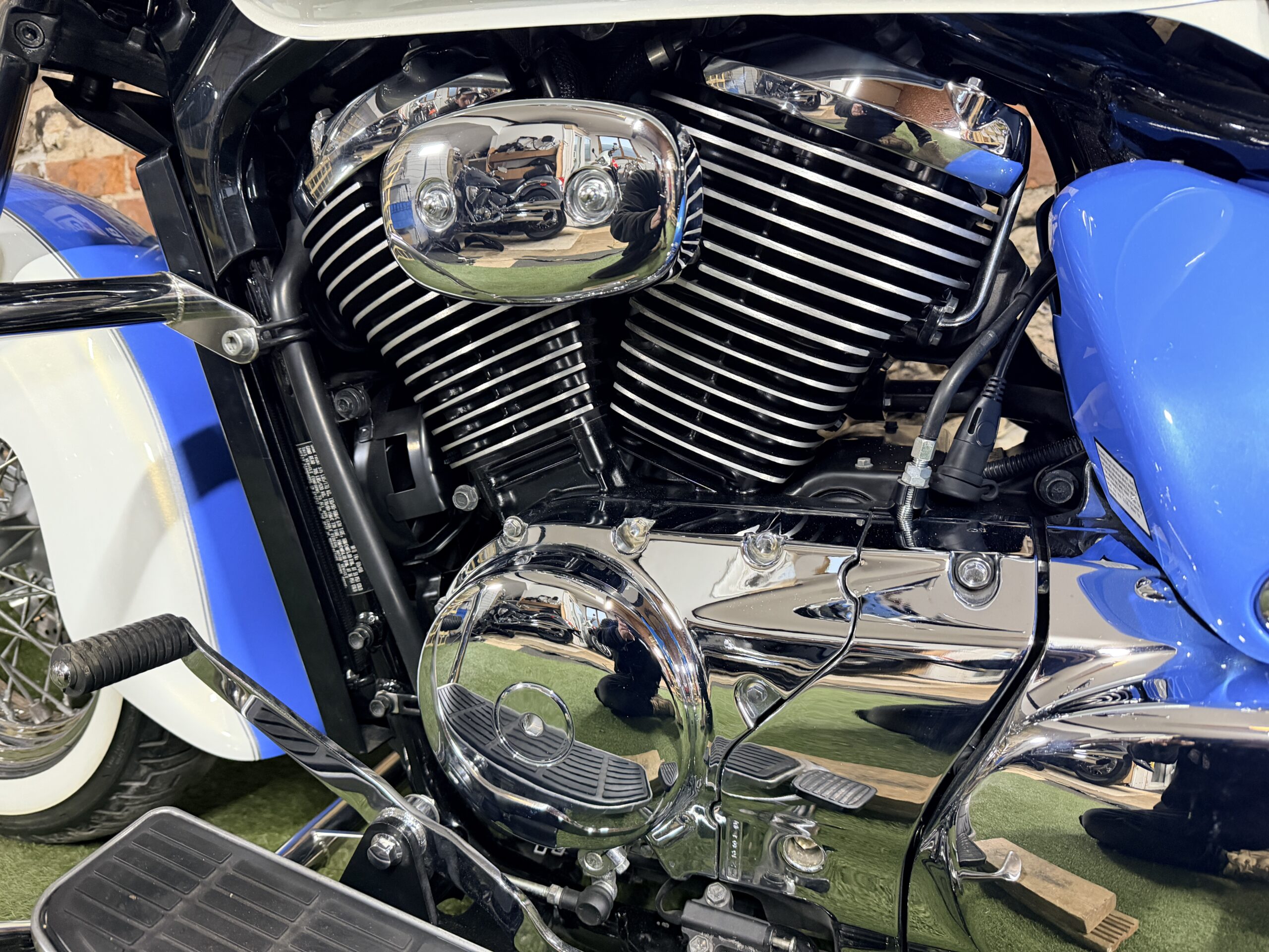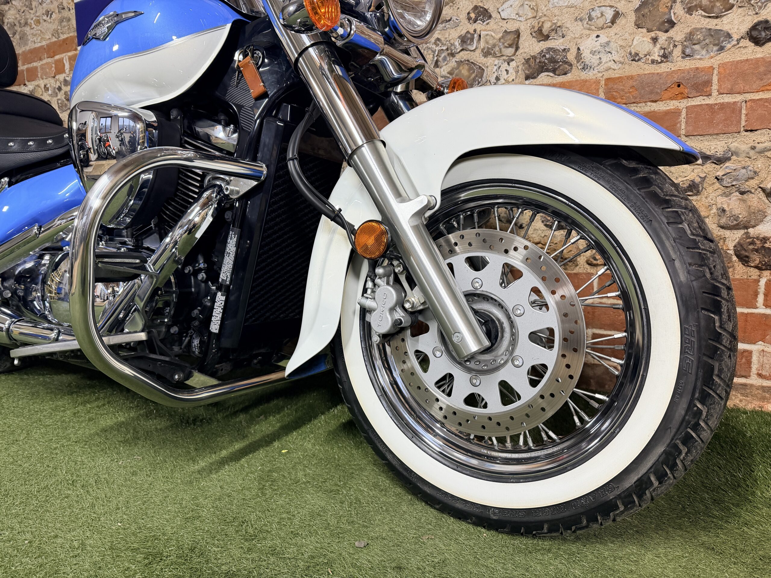 It’s hard to believe this Suzuki cruiser is a 2009 model because it truly looks almost brand new. With under 5k miles, the bike has led a very easy life. The paintwork – a striking Sky Blue and White factory scheme – shines brilliantly, and the chrome gleams as if it were factory-fresh. The whitewall tires are not only a nod to classic 1950s style but are also in great condition, perfectly matching the bike’s retro two-tone aesthetic. This kind of showroom condition is a testament to the care from its previous owner, who clearly adored this machine. You’re effectively getting a time-capsule cruiser without the wear-and-tear normally seen on a 15+ year-old bike.