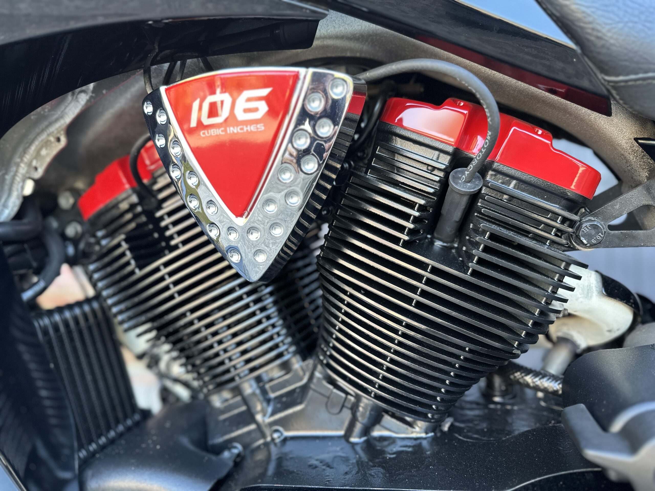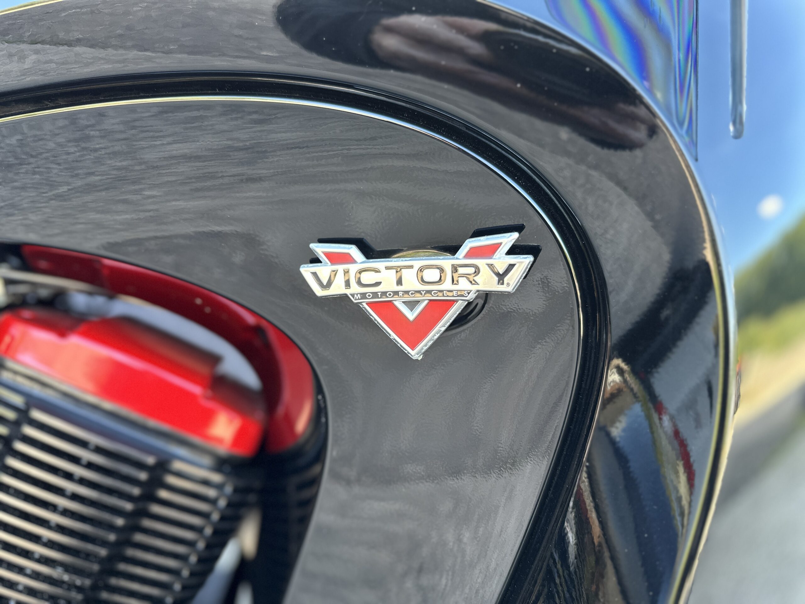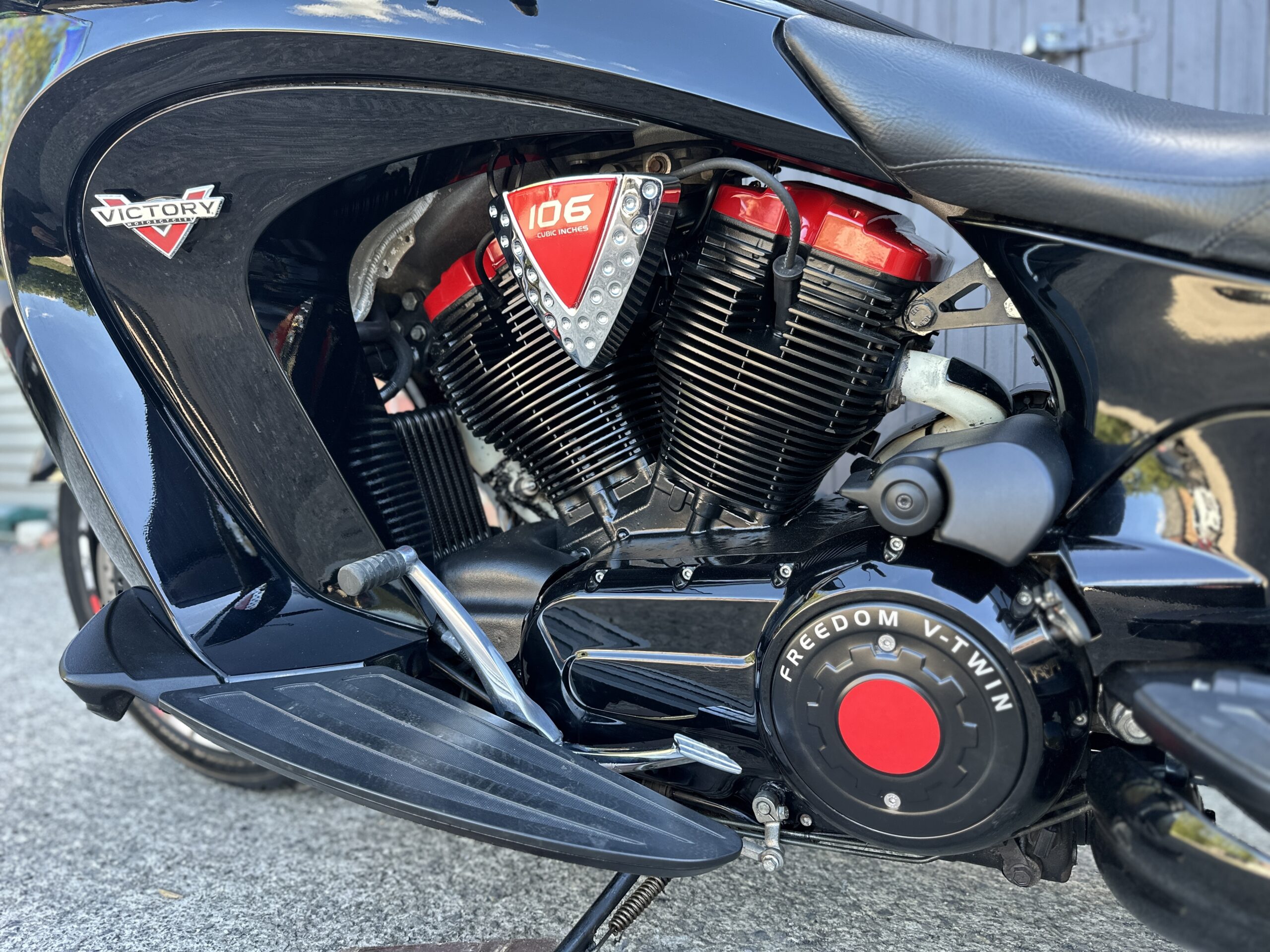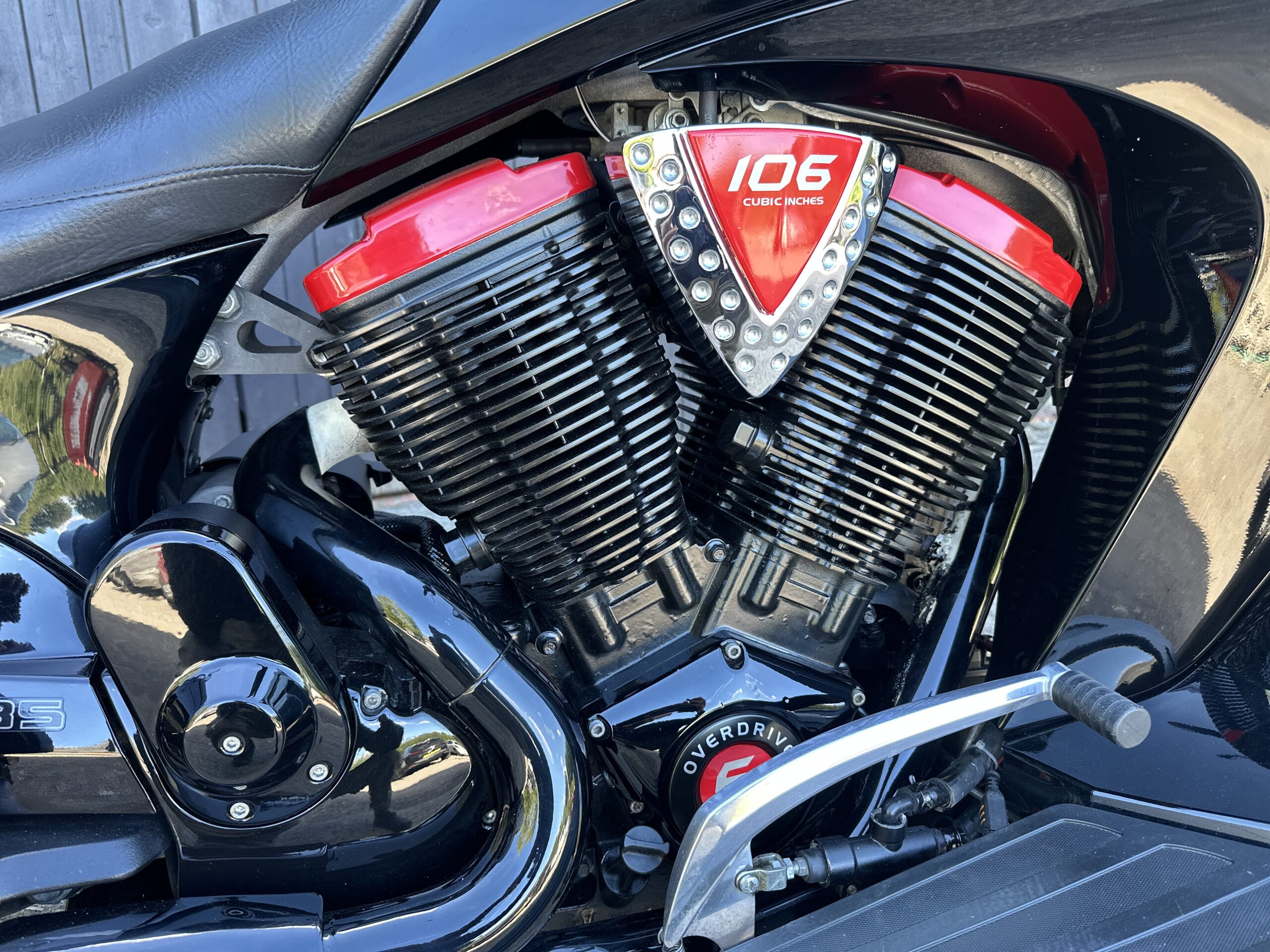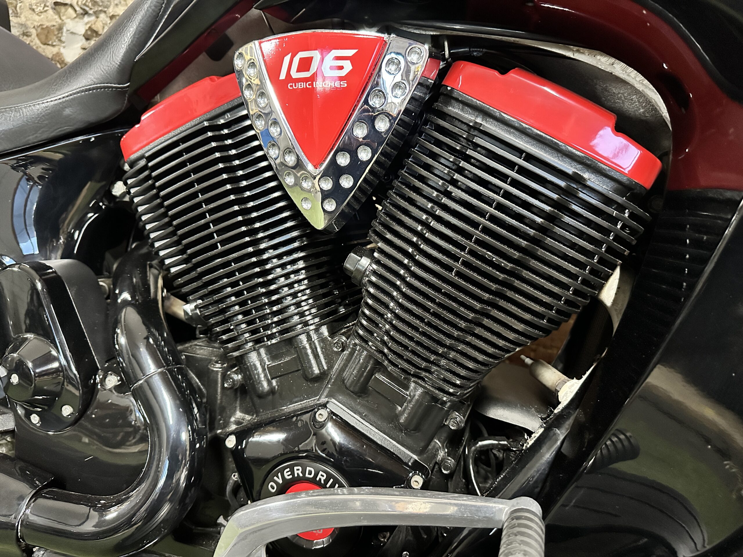Custom Black & Red Aesthetics: We refinished the wheels, belt pulley, engine casings, and exhaust heat shields in gloss black. This gives the bike a fresh, modern look and really complements the Vision’s flowing lines. In contrast, we highlighted the engine with red rocker covers – a subtle nod to Victory’s performance V-twin heart, and a pop of color that ties in with the new graphics.