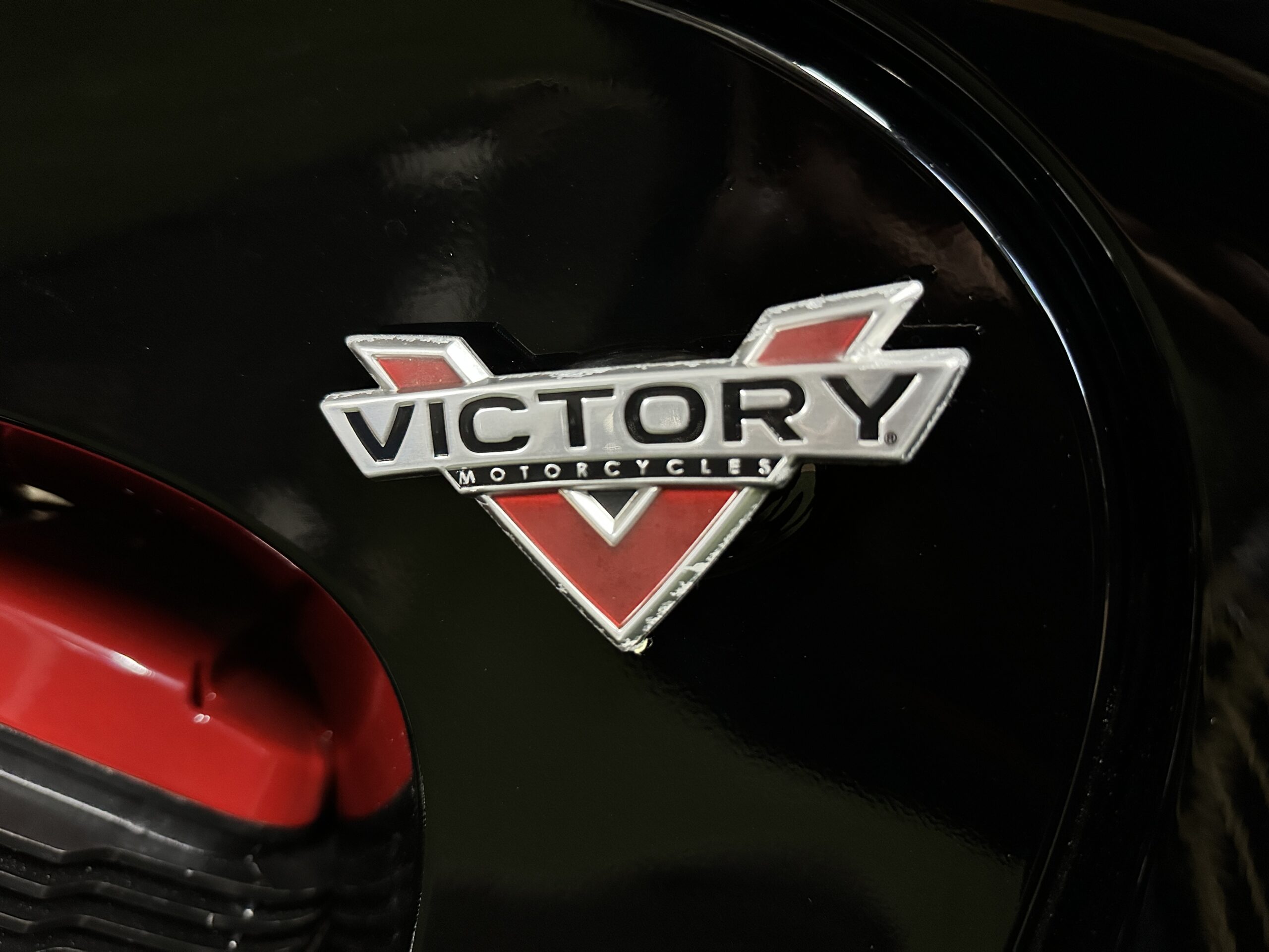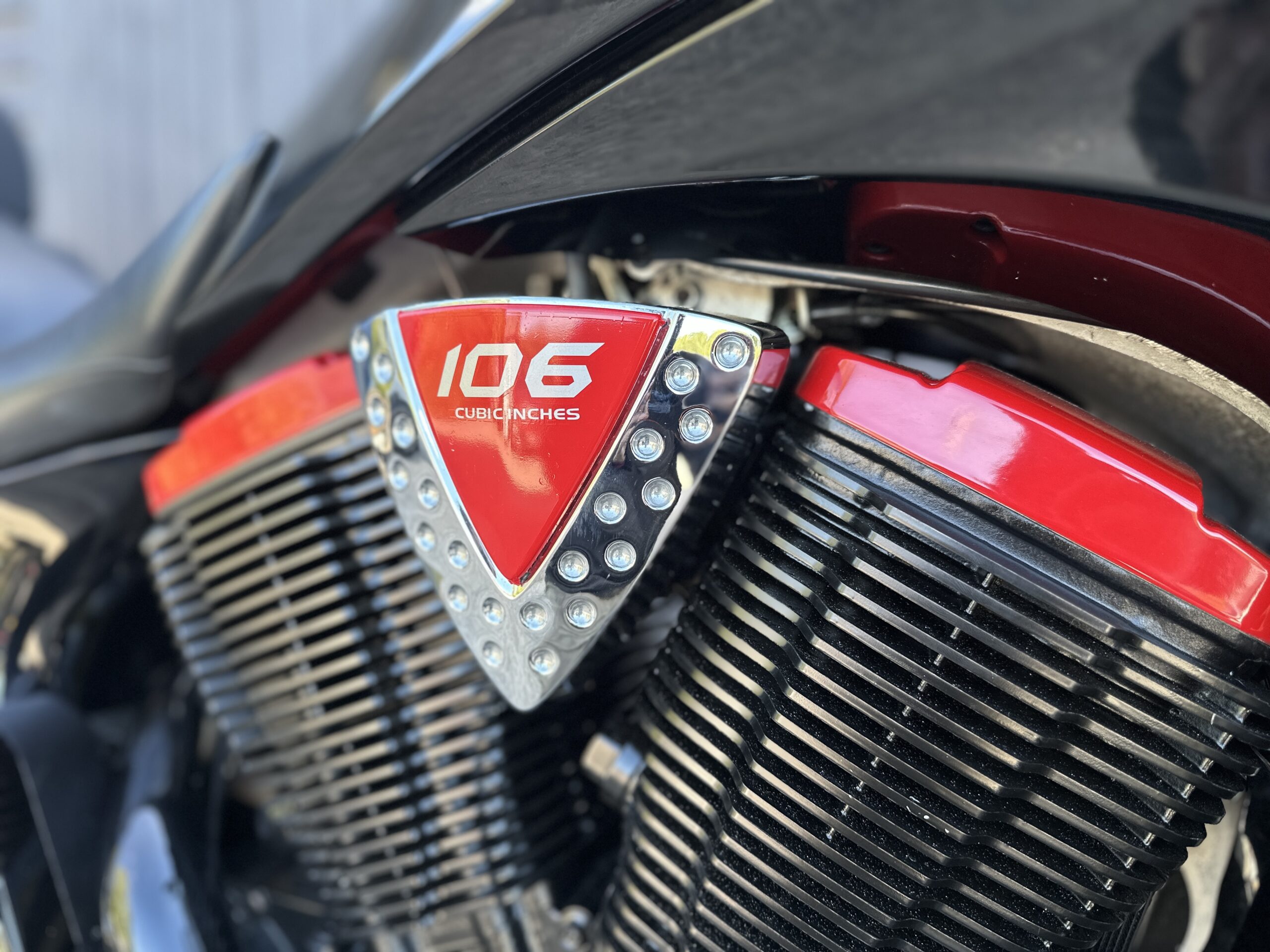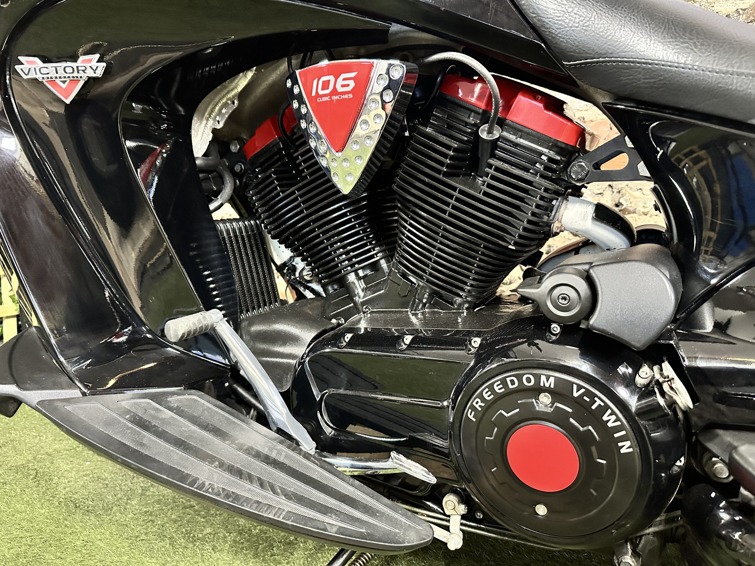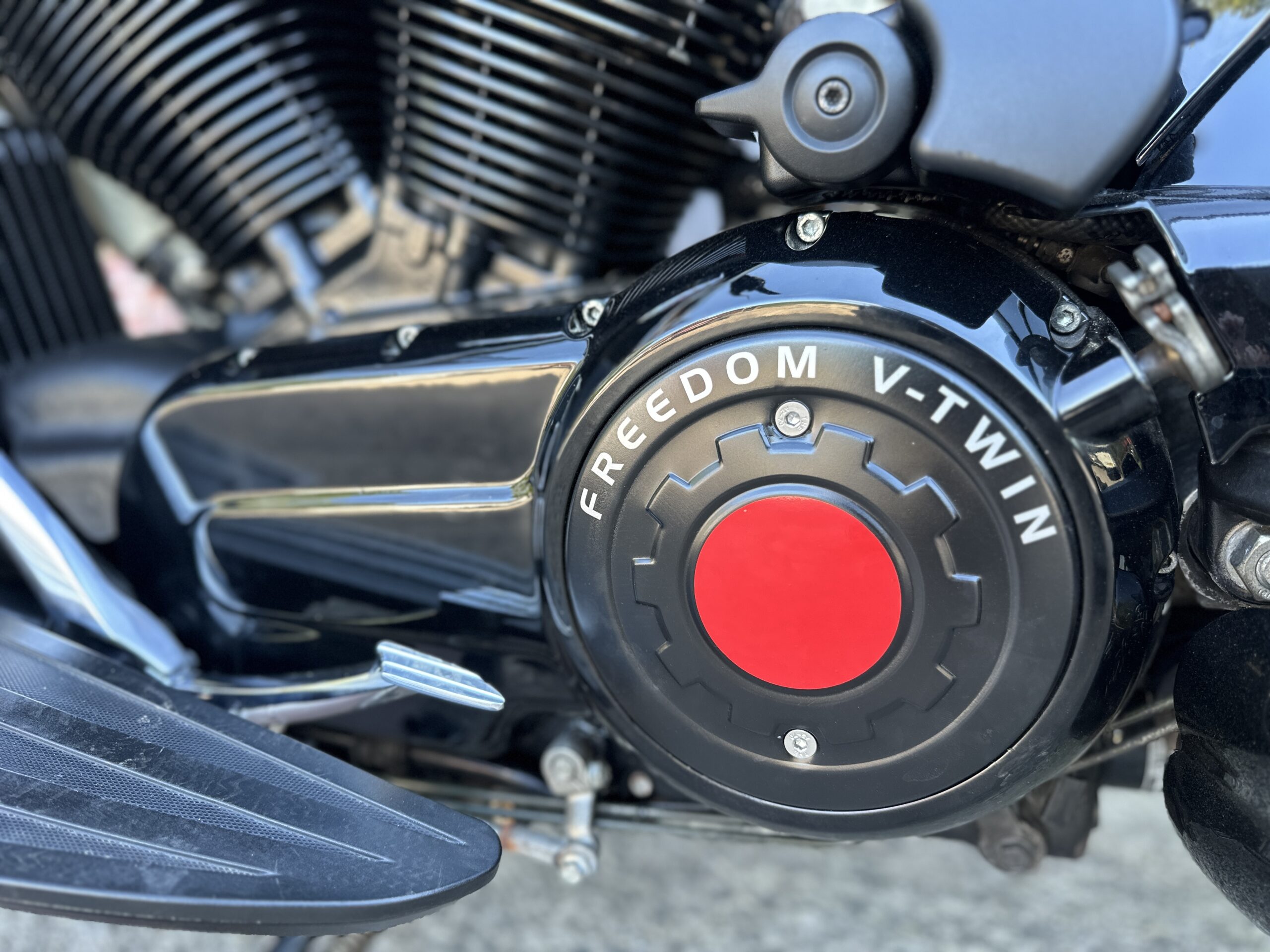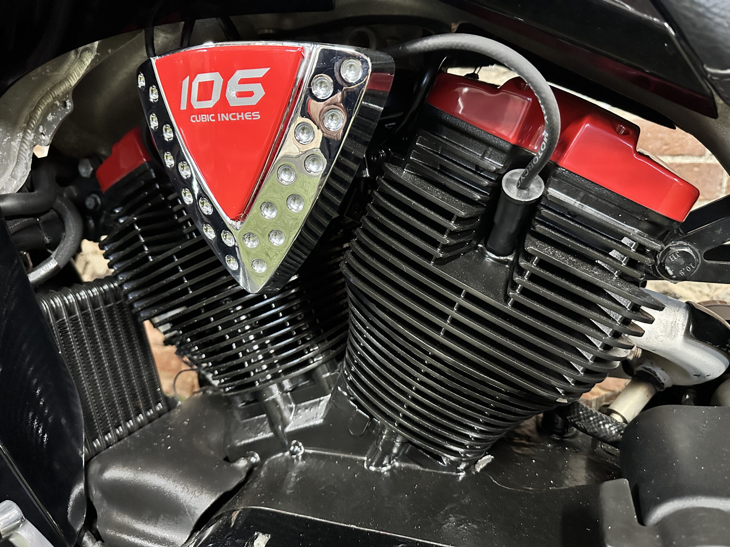Custom Black & Red Aesthetics: We refinished the wheels, belt pulley, engine casings, and exhaust heat shields in gloss black. This gives the bike a fresh, modern look and really complements the Vision’s flowing lines. In contrast, we highlighted the engine with red rocker covers – a subtle nod to Victory’s performance V-twin heart, and a pop of color that ties in with the new graphics.