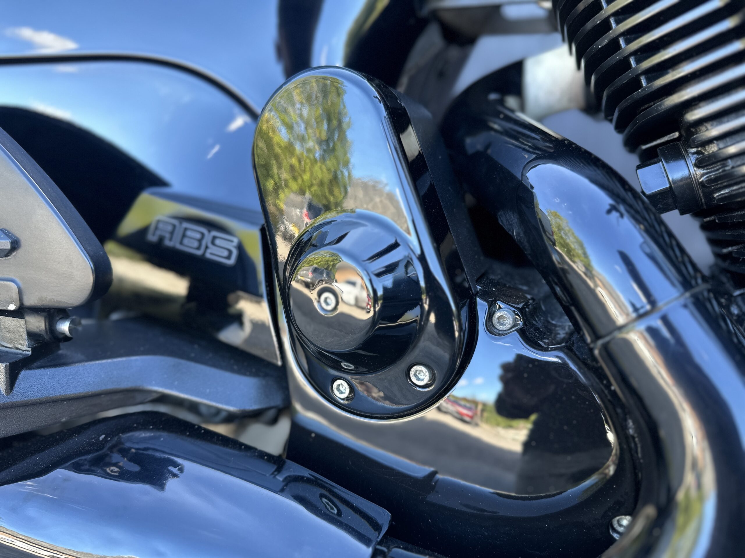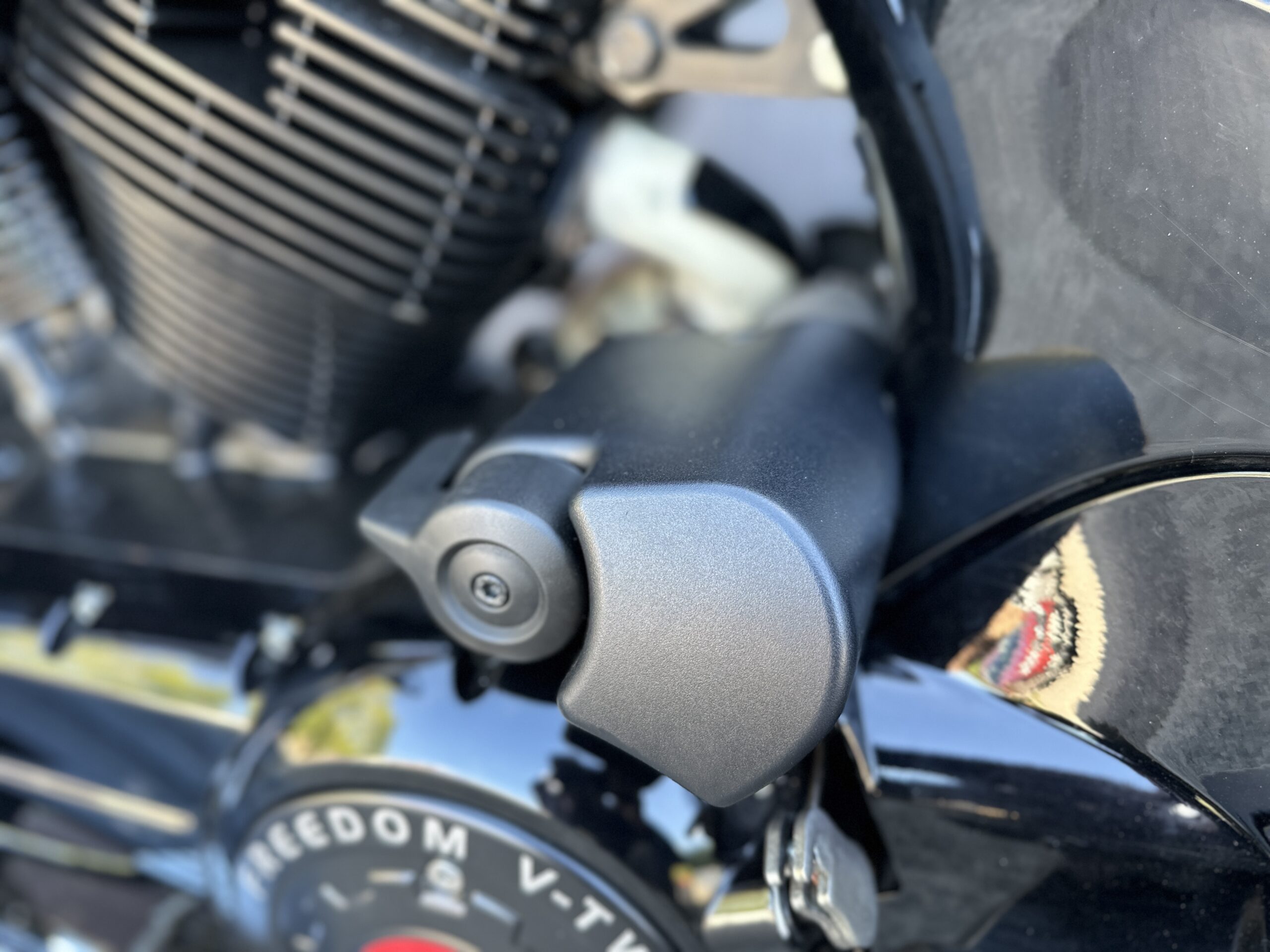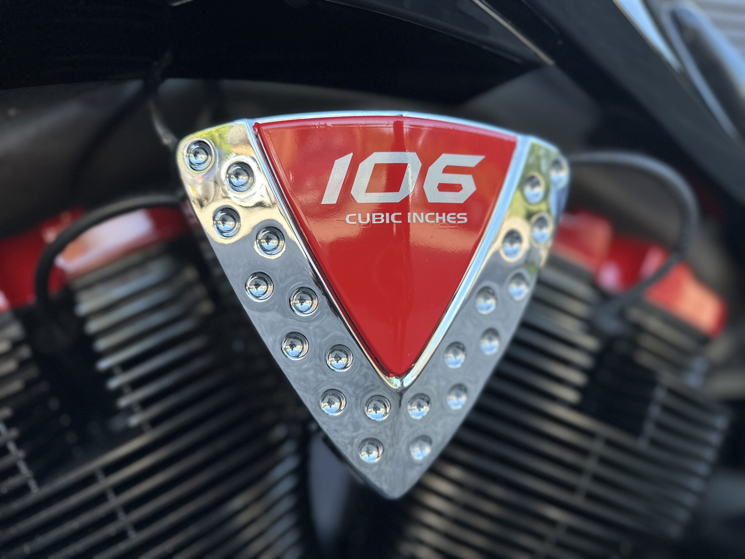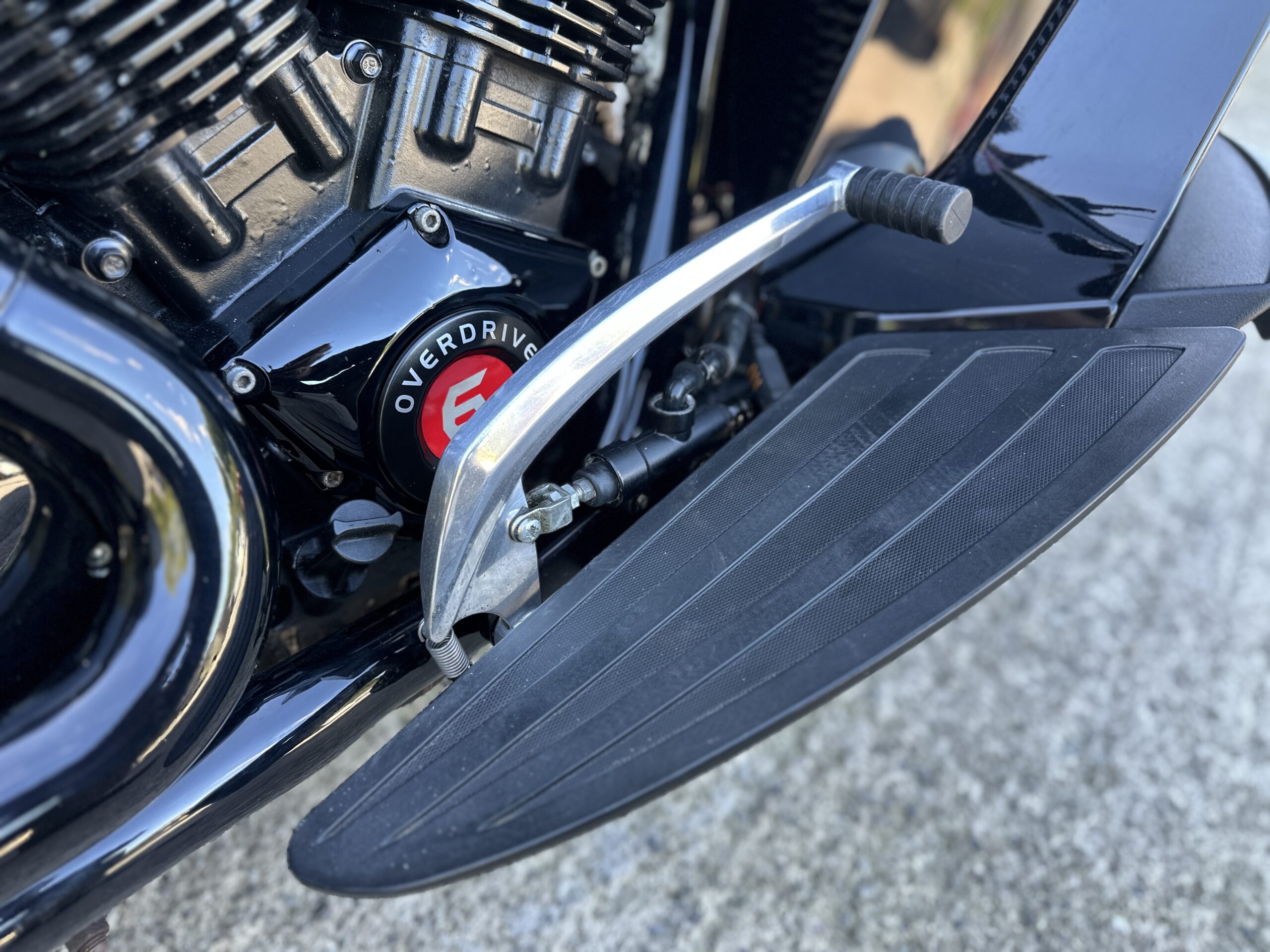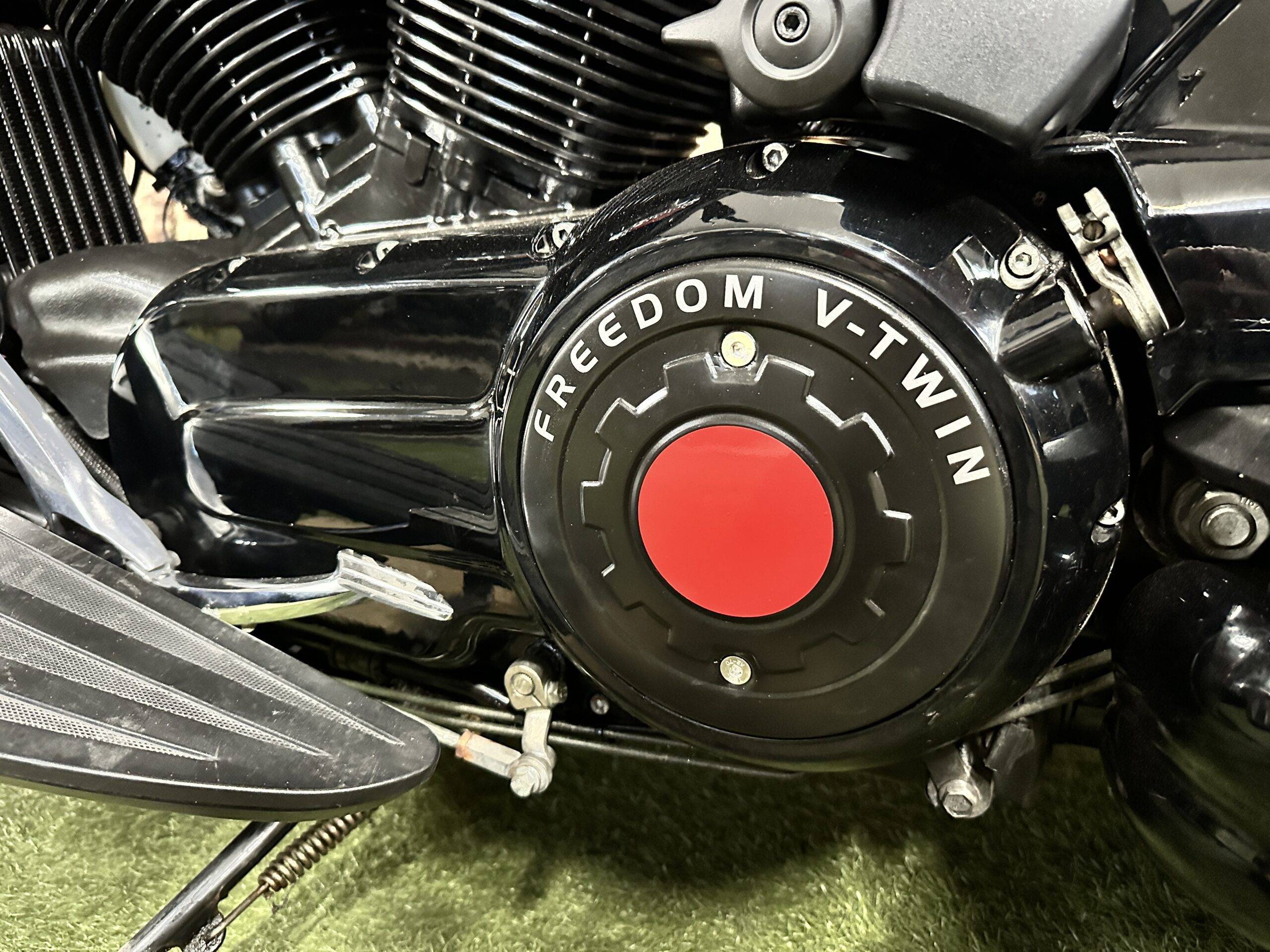 Custom Black & Red Aesthetics: We refinished the wheels, belt pulley, engine casings, and exhaust heat shields in gloss black. This gives the bike a fresh, modern look and really complements the Vision’s flowing lines. In contrast, we highlighted the engine with red rocker covers – a subtle nod to Victory’s performance V-twin heart, and a pop of color that ties in with the new graphics.