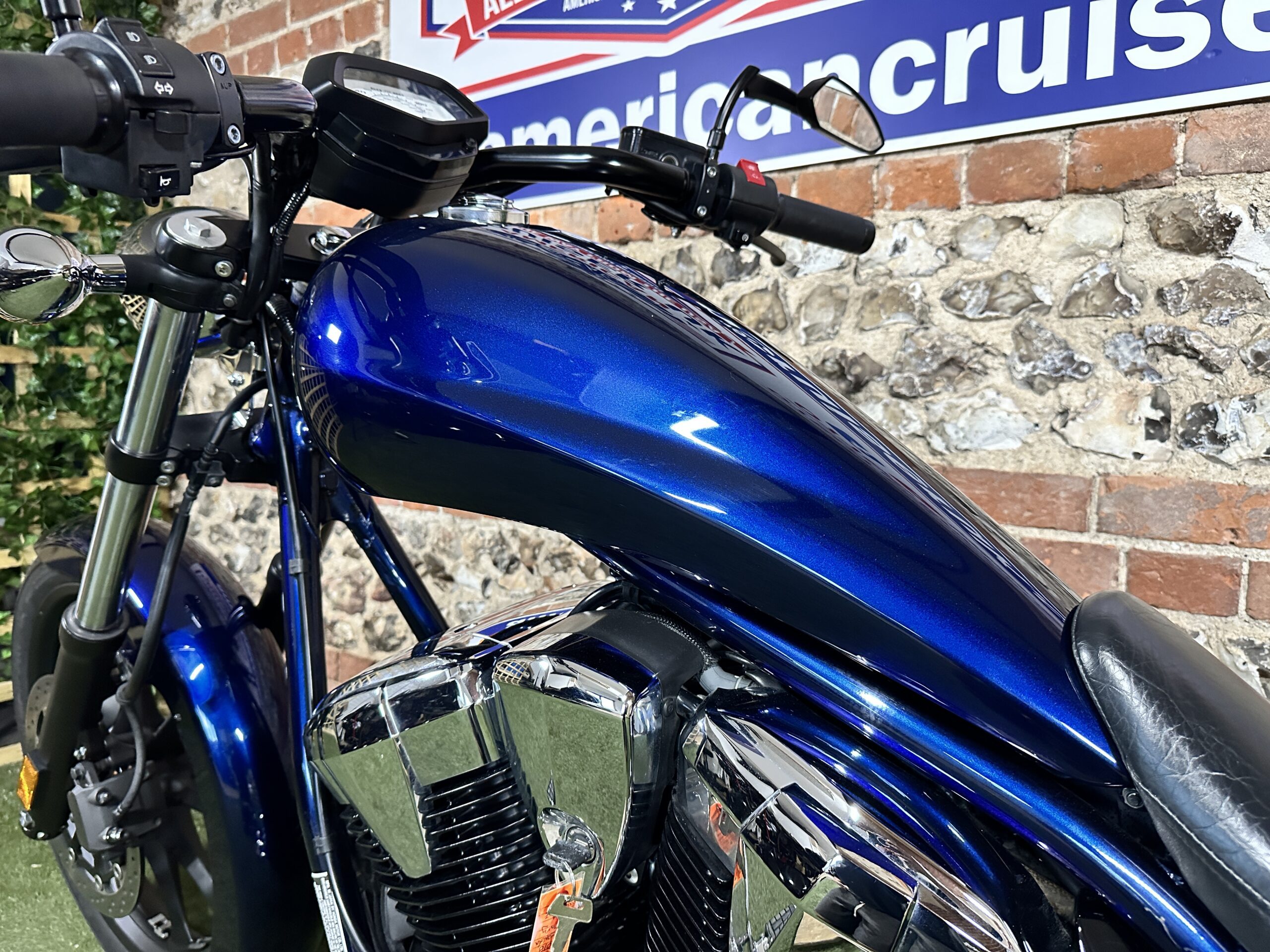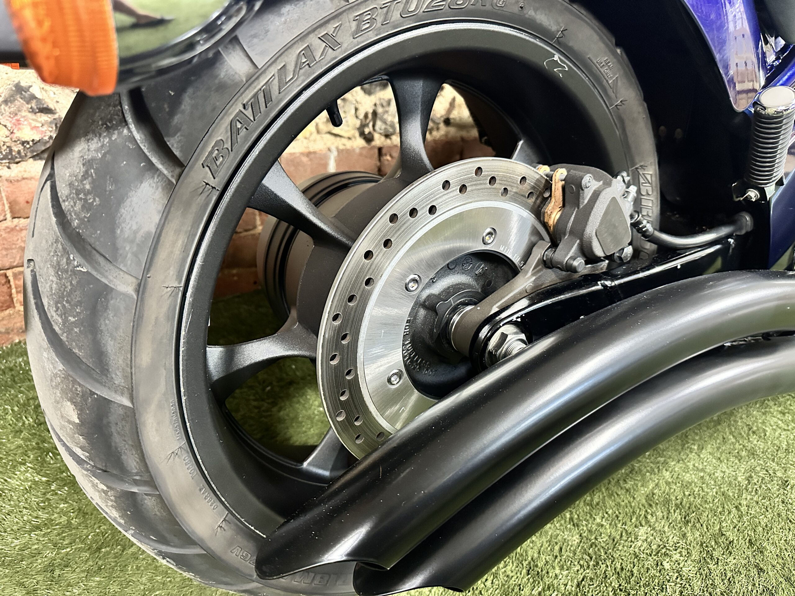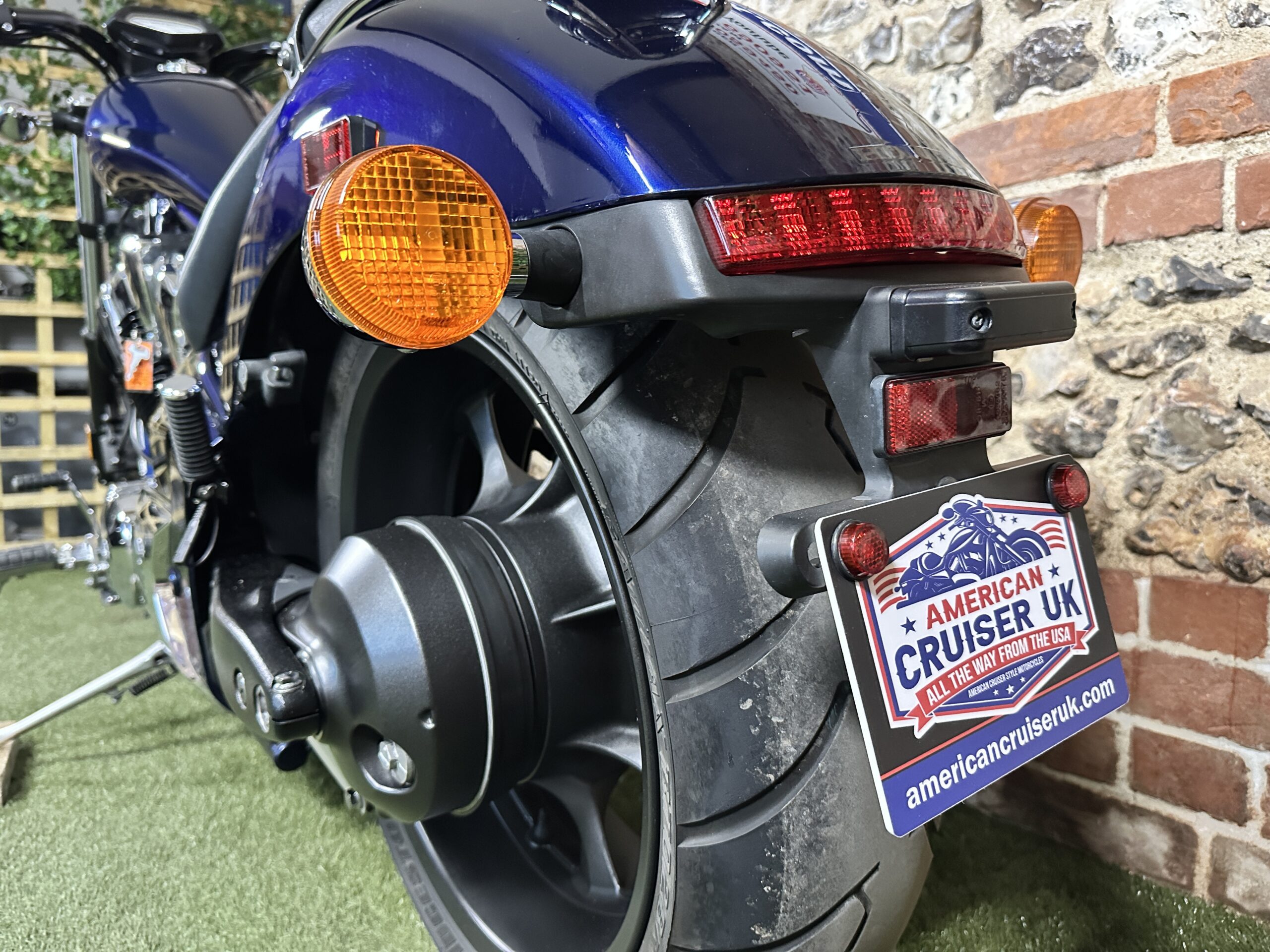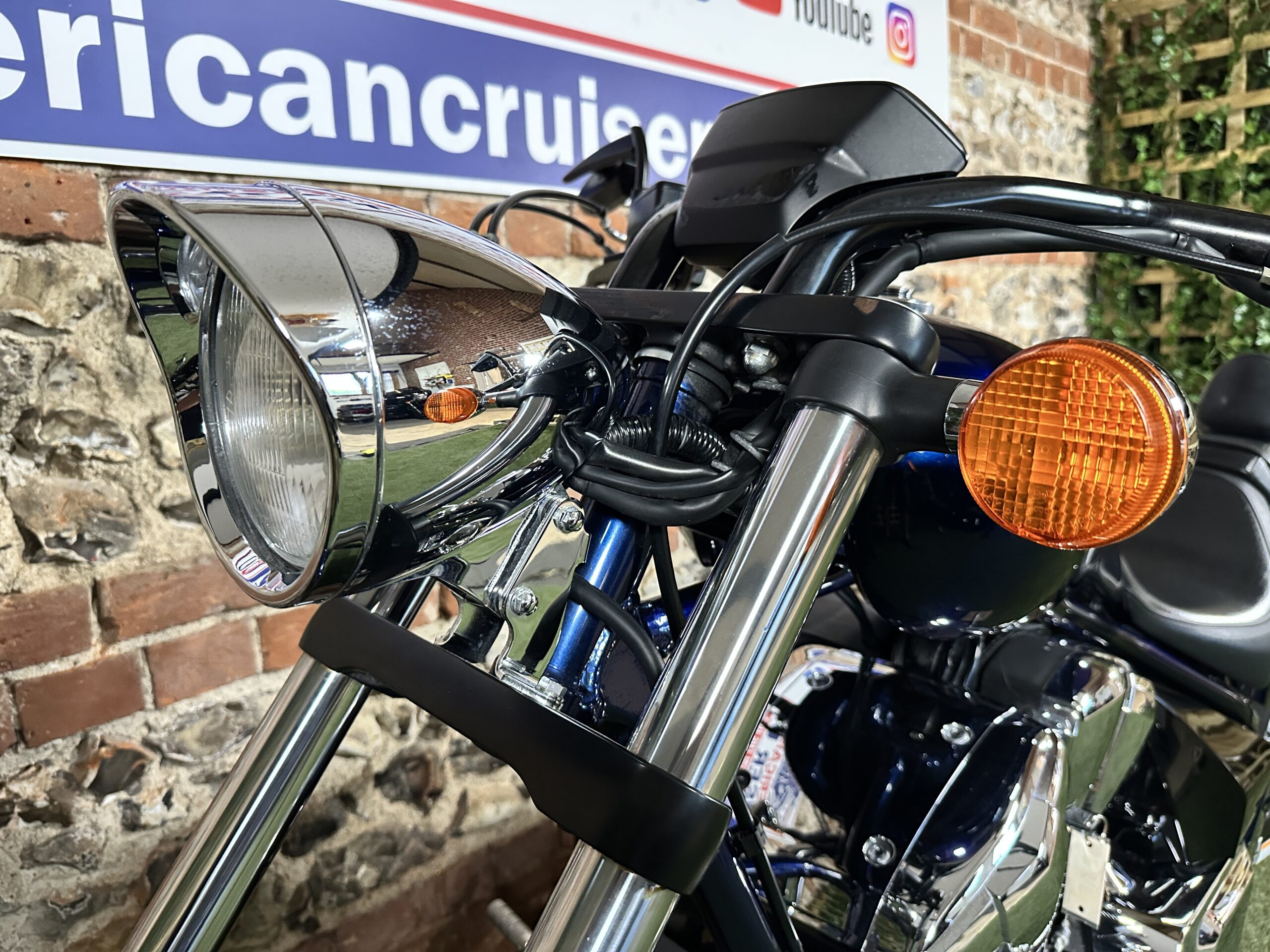 This bike is a true gem. A one-owner machine imported from Florida, it’s in immaculate condition with only 12,888 miles on the clock. Finished in a stunning deep metallic blue, the paintwork looks spectacular in the sunlight. The blacked-out engine, wheels, forks, and exhaust add a modern, aggressive twist to the design, setting it apart from earlier chrome-heavy versions.