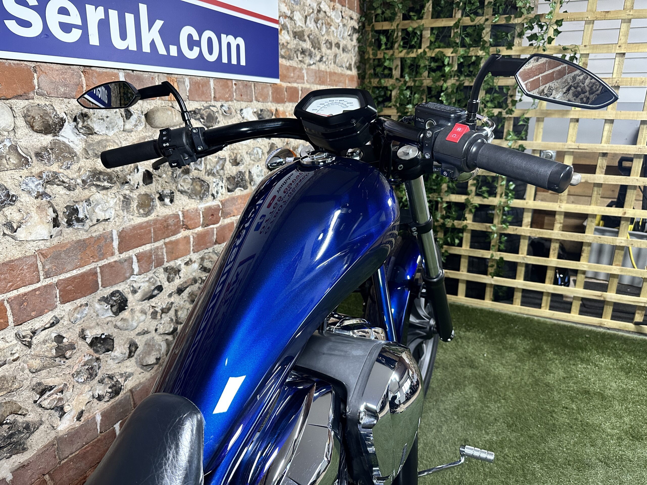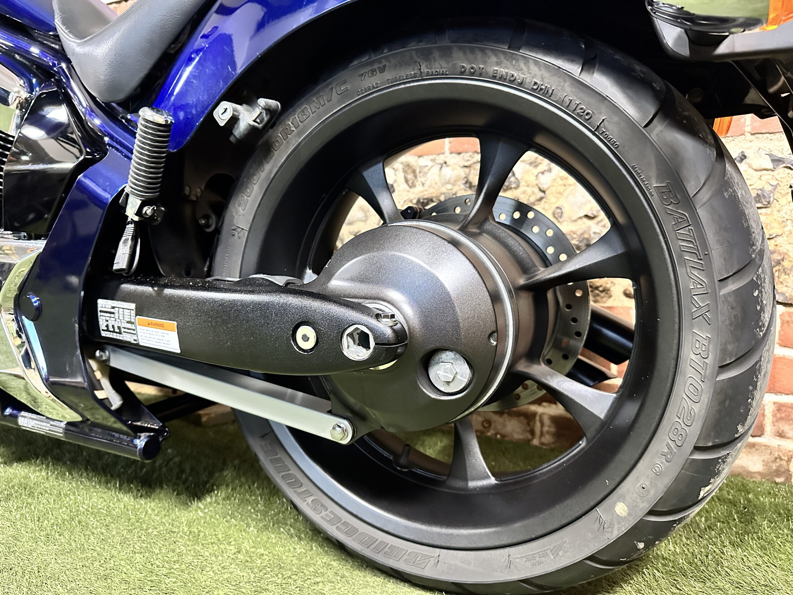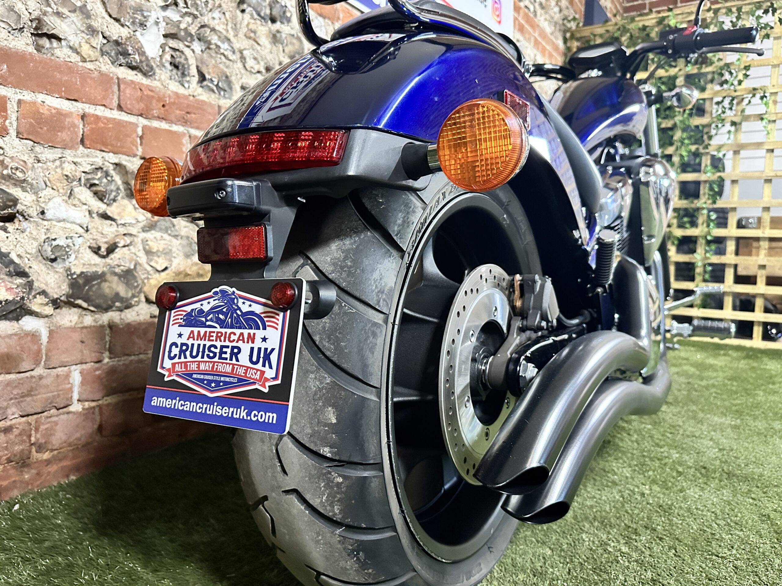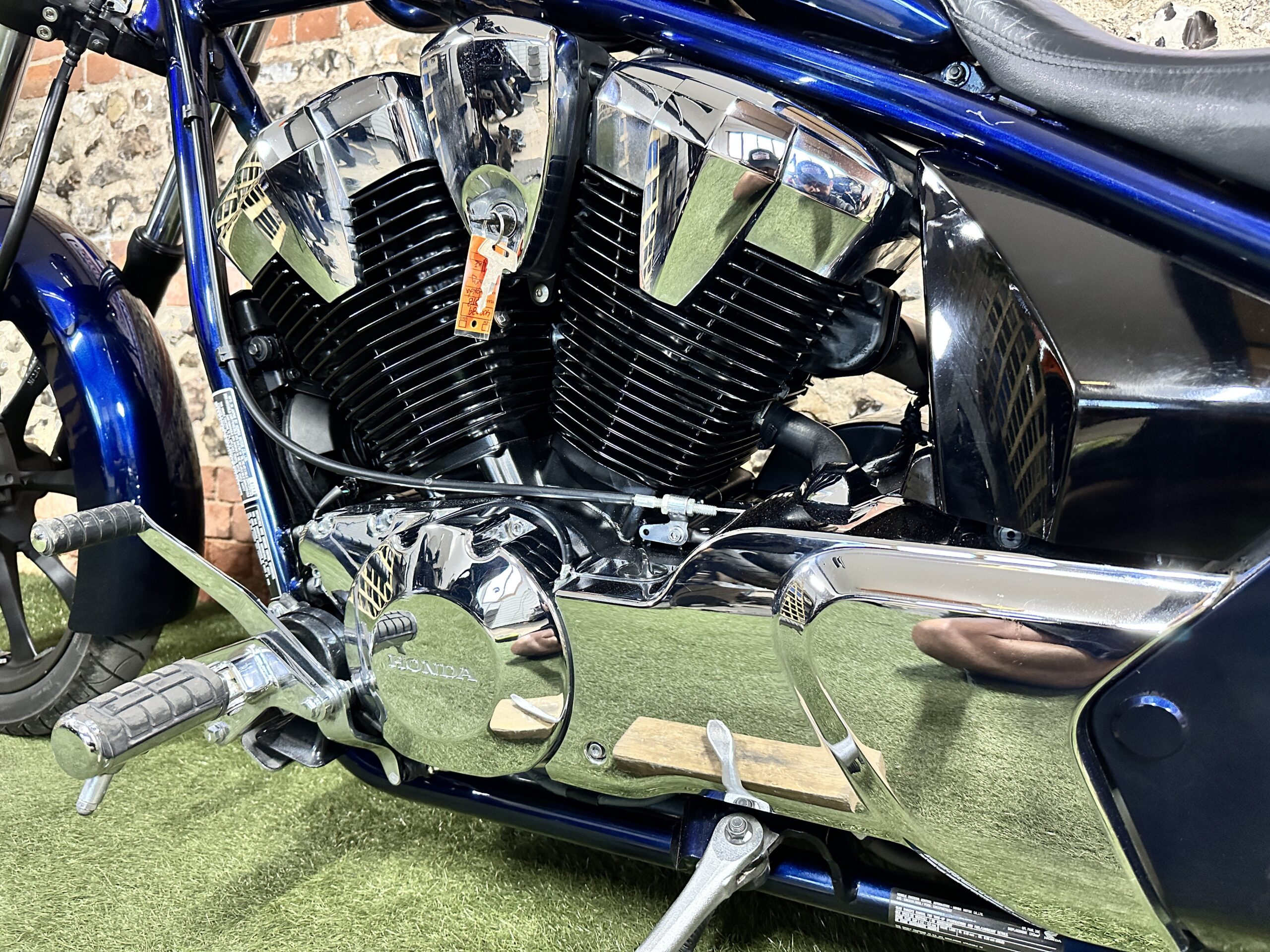 This bike is a true gem. A one-owner machine imported from Florida, it’s in immaculate condition with only 12,888 miles on the clock. Finished in a stunning deep metallic blue, the paintwork looks spectacular in the sunlight. The blacked-out engine, wheels, forks, and exhaust add a modern, aggressive twist to the design, setting it apart from earlier chrome-heavy versions.