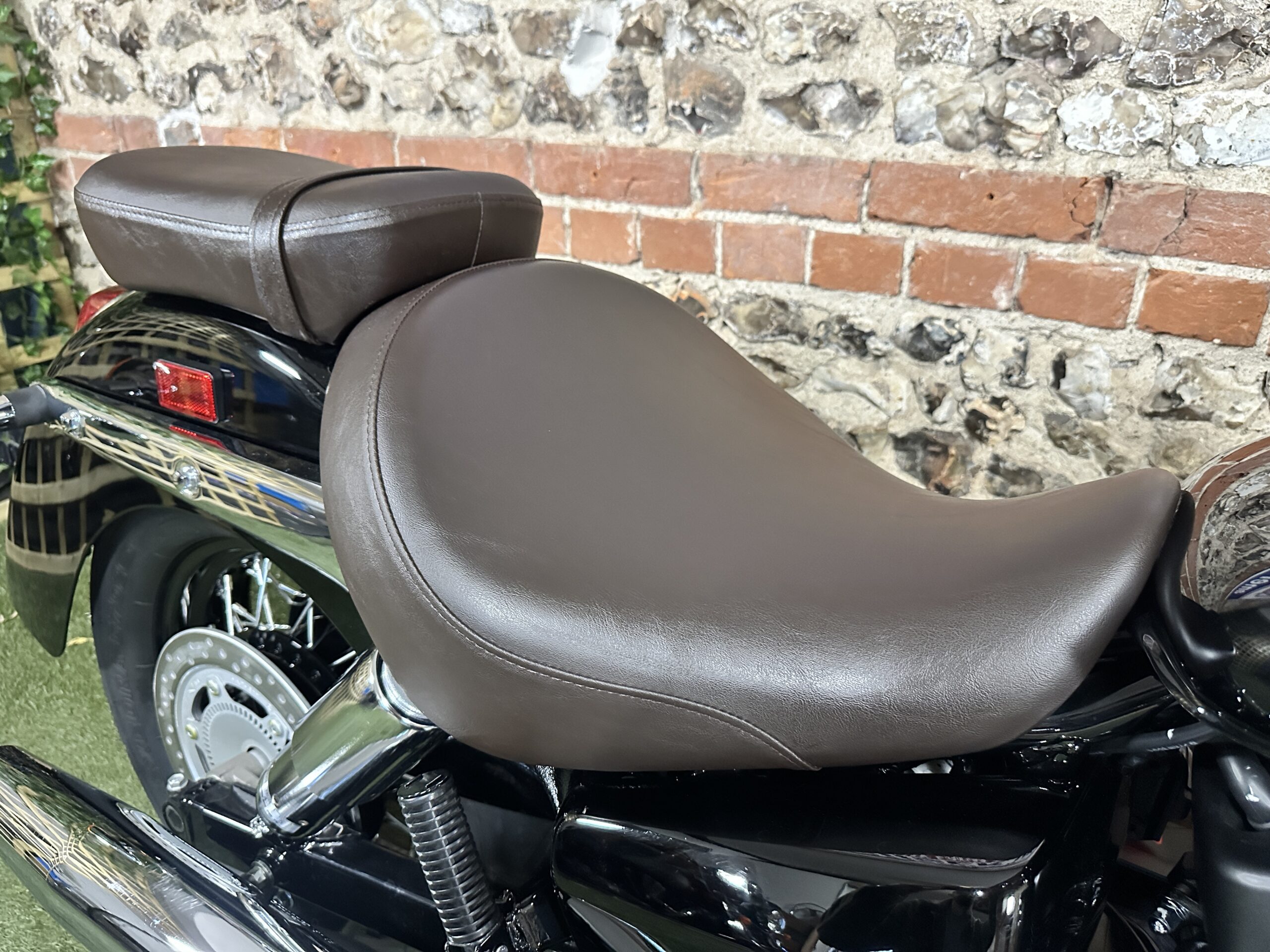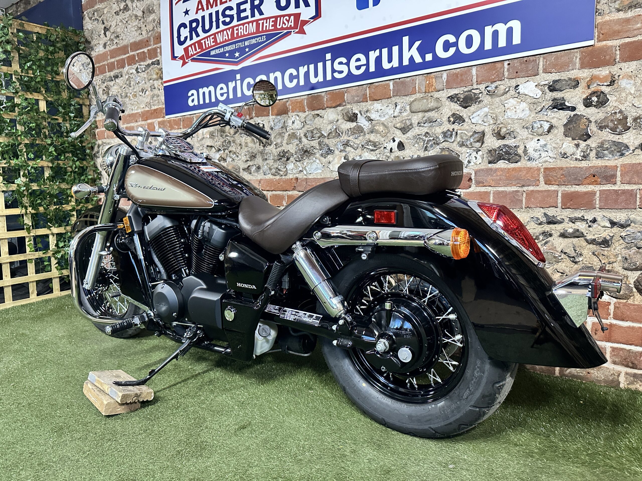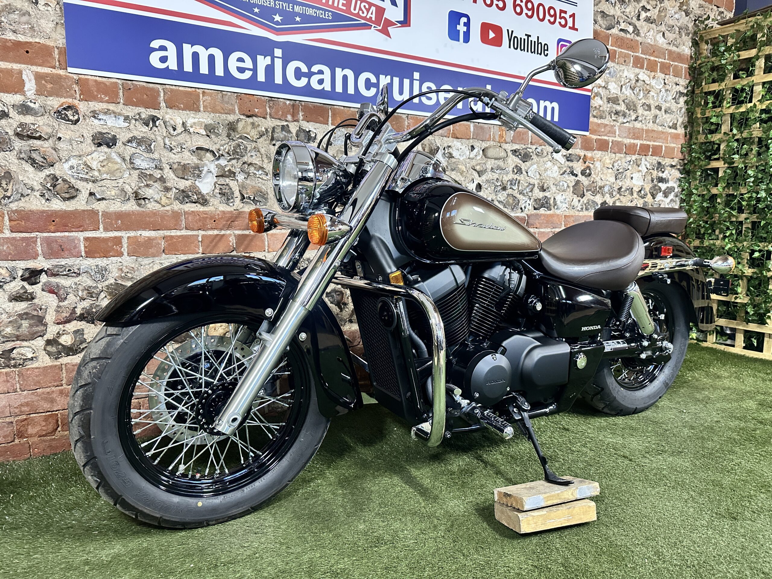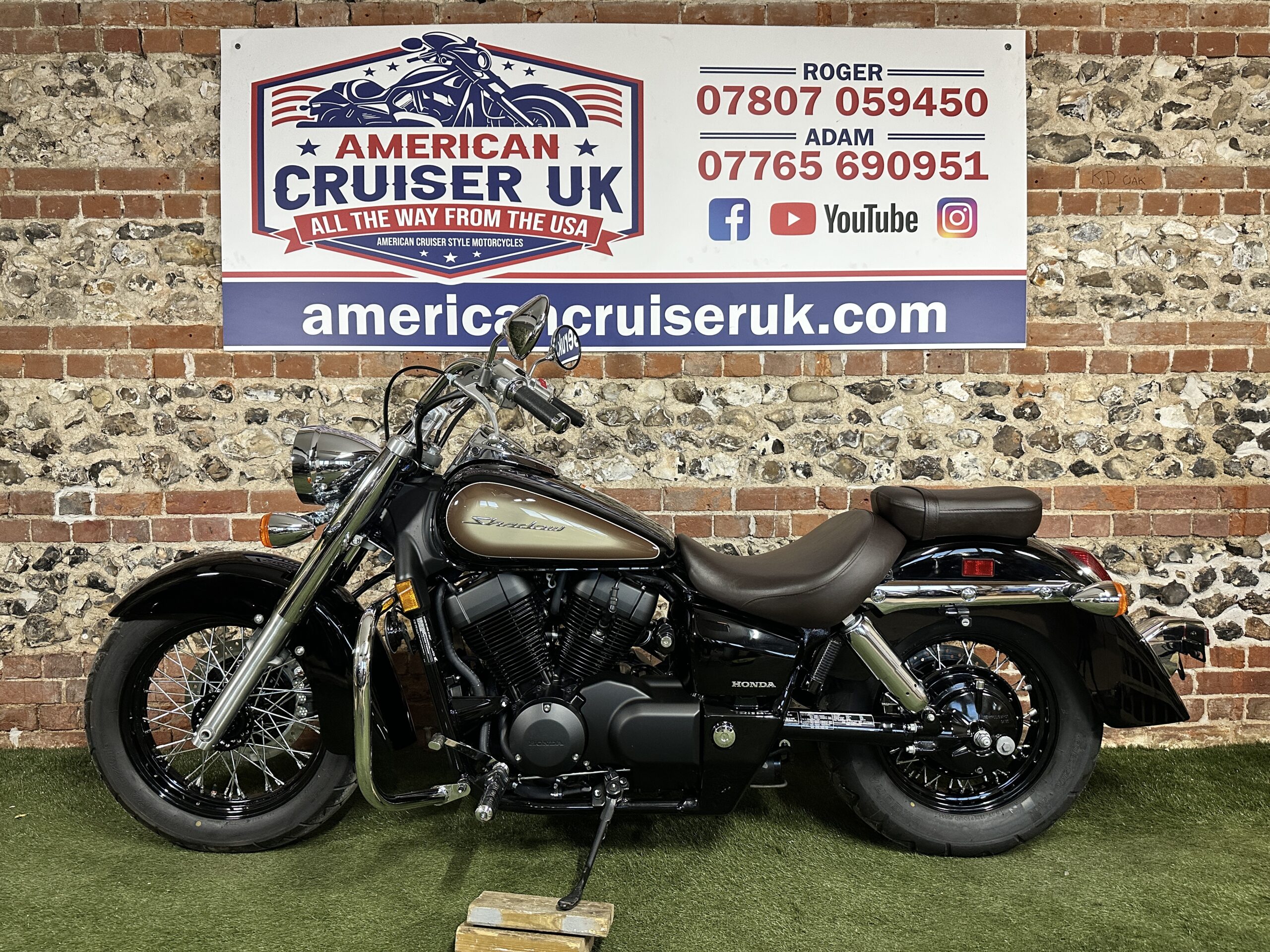 Our 2024 Honda Shadow Aero in its stunning two-tone black/brown finish and blacked-out engine – a like-new cruiser that’s finally available in the UK.